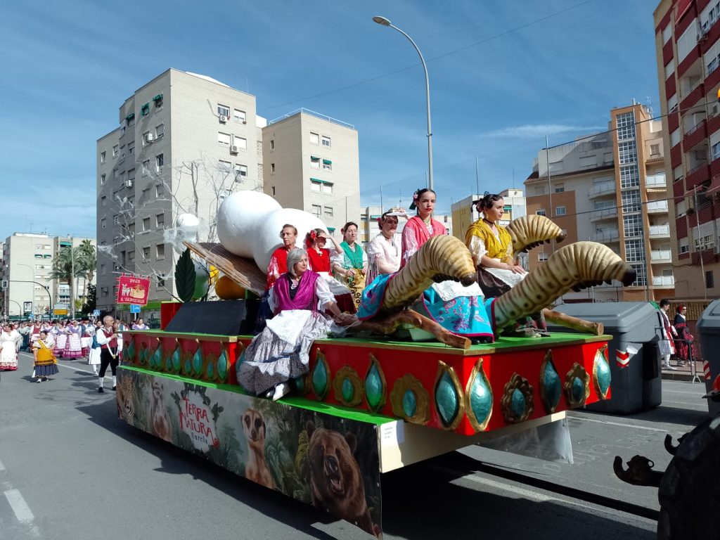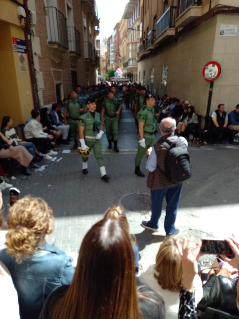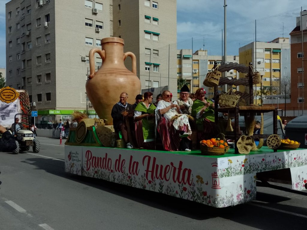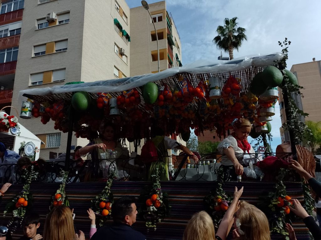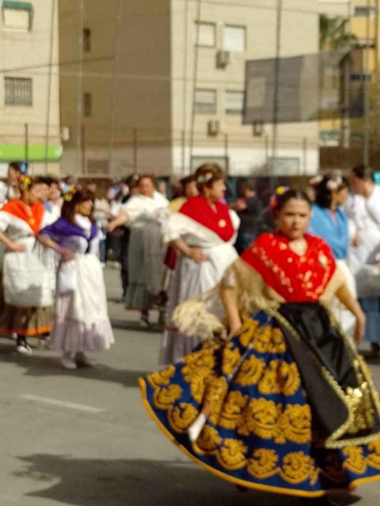 Dinsdag: is het lentefeest in Murcia. Van de buurman hebben wij een foldertje gekregen waar alle processies en optochten met route en al in staan. Wij kiezen ervoor om om 17.00 uur naar de ‘Bando de le Huerta’ optocht te gaan. Daar hebben we geen spijt van gekregen want we hebben genoten van de optocht en de prachtig verklede mensen op straat. Volgens ons is iedere spanjaard wel verkleed. De dames hebben prachtige jurken aan en bijna alle heren een witte broekrok met witte kousen. Ook heeft bijna iedereen aparte schoenen aan ik weet zo even niet hoe deze schoenen heetten maar ze horen bij de traditie neem ik aan. Het weer zit ook mee want het is heerlijk zonnig en het waait eens een keertje niet. De laatste wagens van de optocht delen van alles uit, denk hierbij aan snoep, koek, bier, wijn. groente, potjes kruiden, blikjes olijven, petjes en weet ik veel wat nog meer. Mensen gaan naar huis met tassen en karretjes vol met spullen.