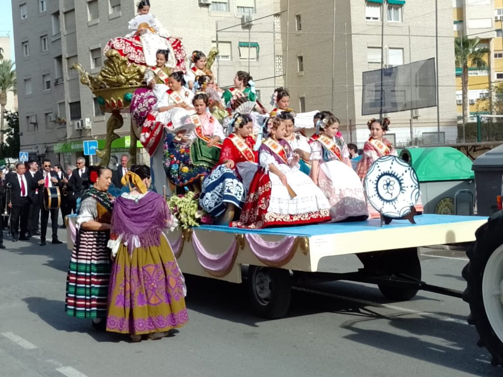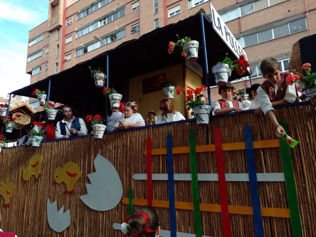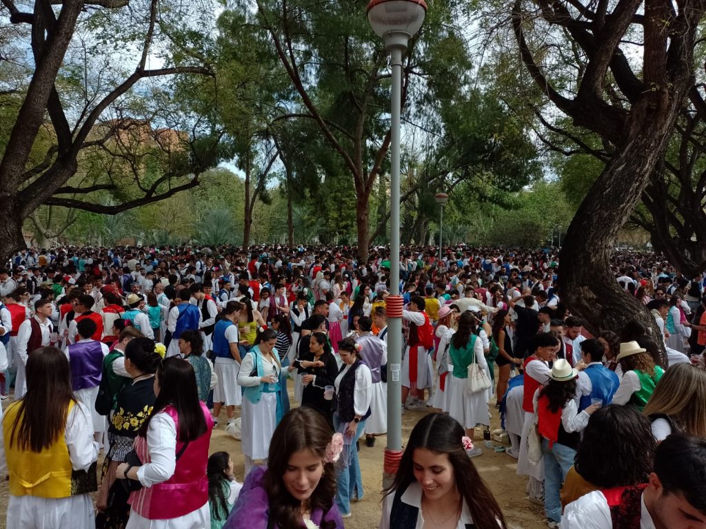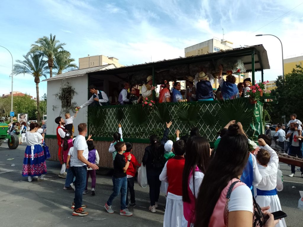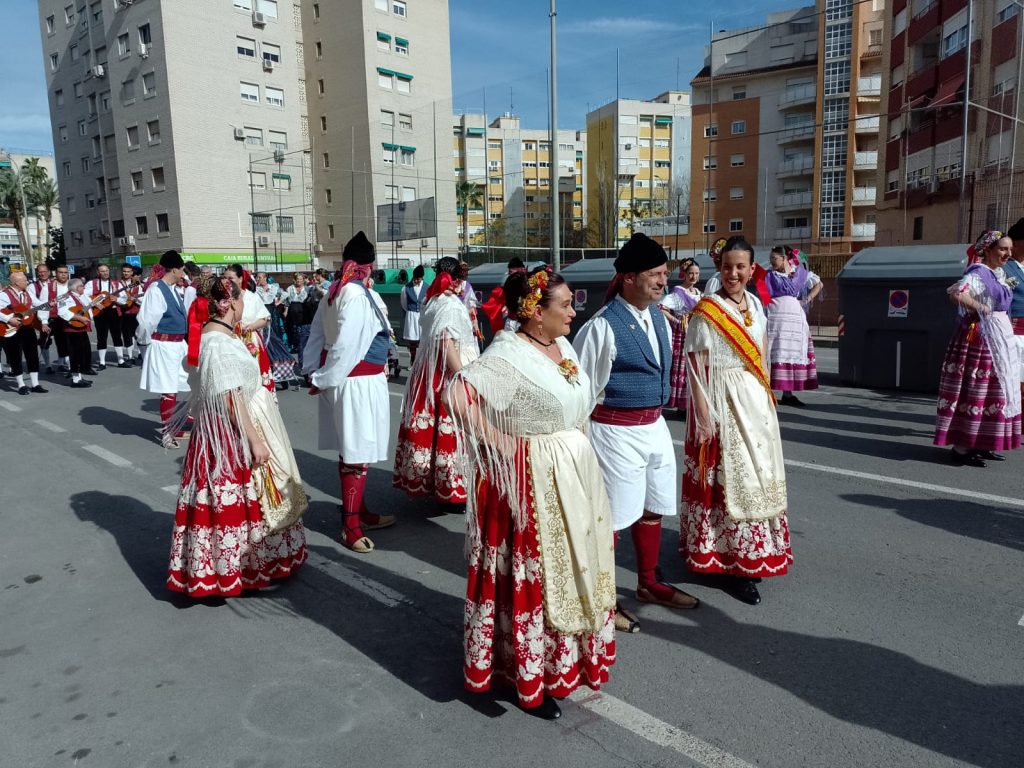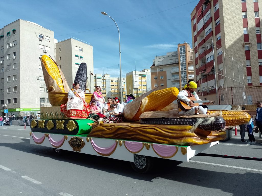 Dinsdag: is het lentefeest in Murcia. Van de buurman hebben wij een foldertje gekregen waar alle processies en optochten met route en al in staan. Wij kiezen ervoor om om 17.00 uur naar de ‘Bando de le Huerta’ optocht te gaan. Daar hebben we geen spijt van gekregen want we hebben genoten van de optocht en de prachtig verklede mensen op straat. Volgens ons is iedere spanjaard wel verkleed. De dames hebben prachtige jurken aan en bijna alle heren een witte broekrok met witte kousen. Ook heeft bijna iedereen aparte schoenen aan ik weet zo even niet hoe deze schoenen heetten maar ze horen bij de traditie neem ik aan. Het weer zit ook mee want het is heerlijk zonnig en het waait eens een keertje niet. De laatste wagens van de optocht delen van alles uit, denk hierbij aan snoep, koek, bier, wijn. groente, potjes kruiden, blikjes olijven, petjes en weet ik veel wat nog meer. Mensen gaan naar huis met tassen en karretjes vol met spullen.