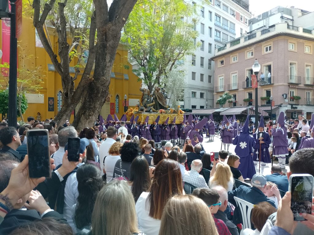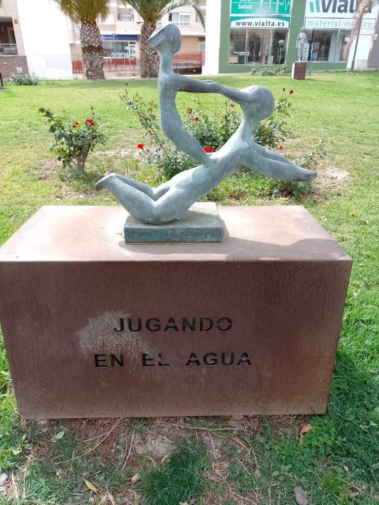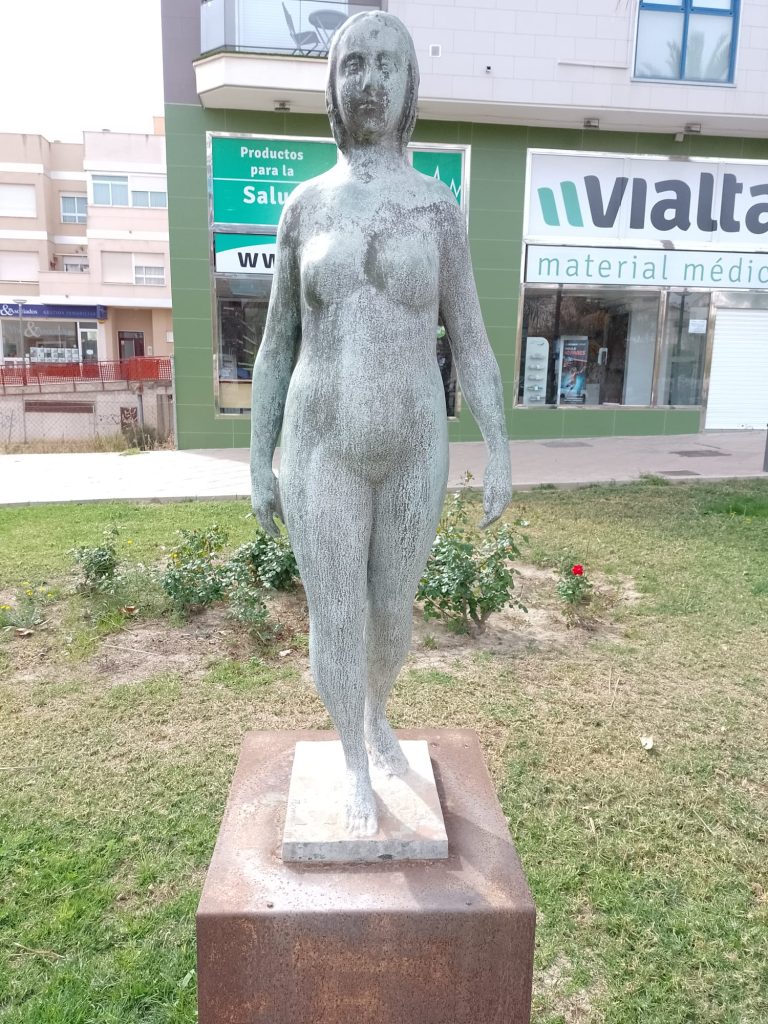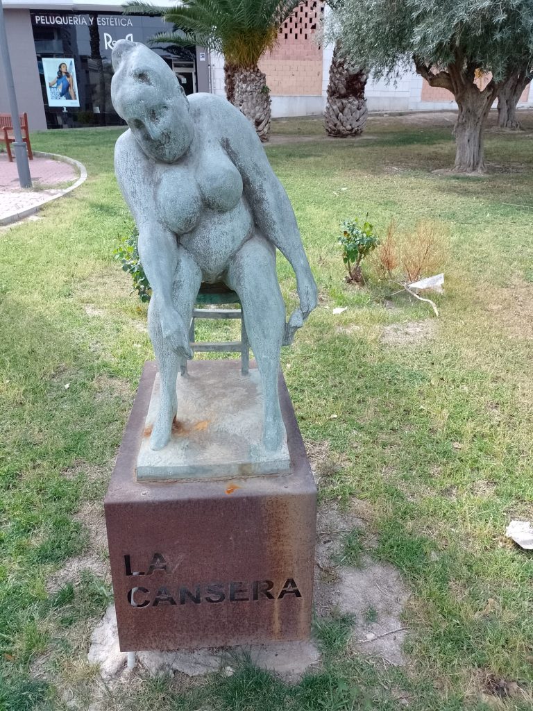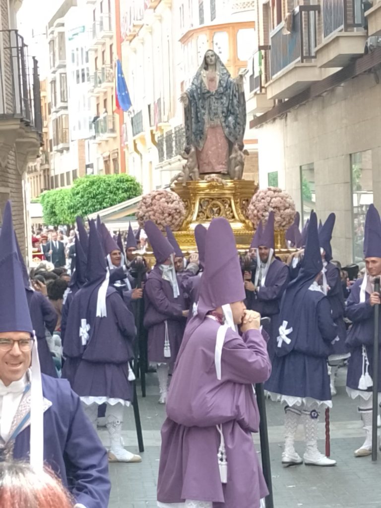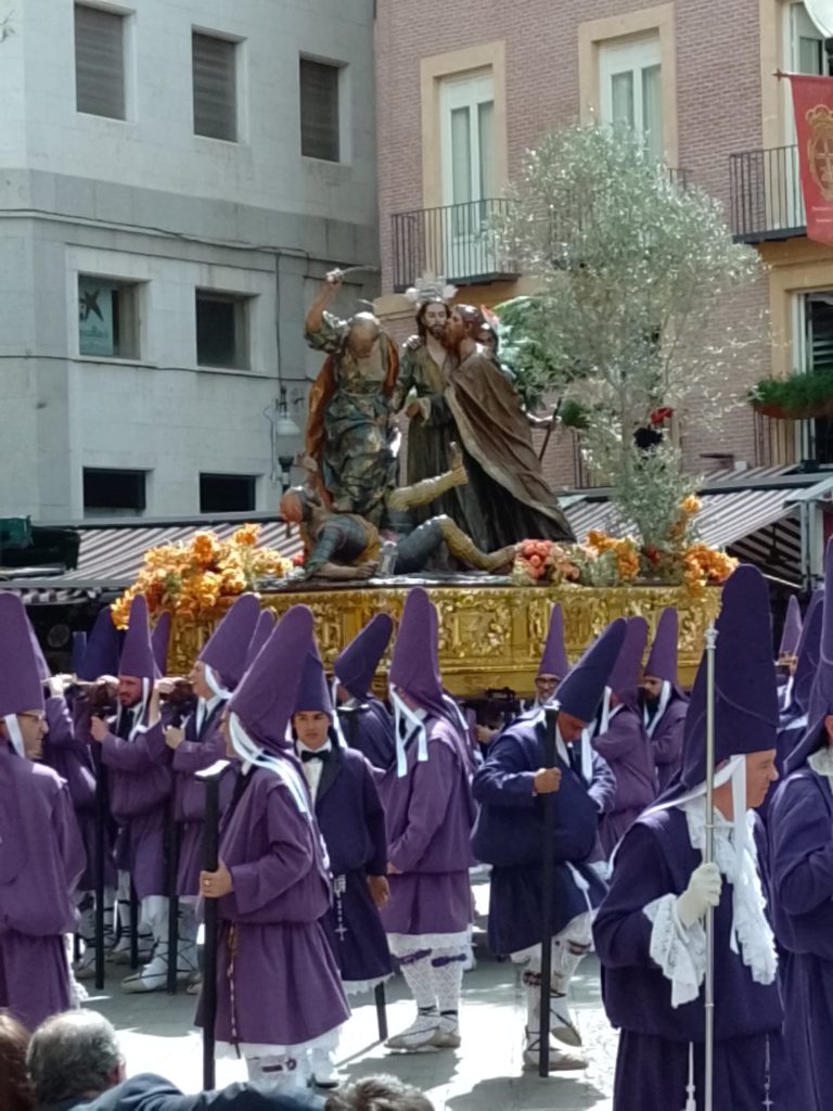Goede vrijdag: Onze bedoeling was om langs de Itineo dealer te fietsen om persoonlijk te informeren of zij een koplamp voor ons kunnen bestellen (in die van ons zit een gat….). We hebben al mailcontact gehad maar de laatste twee dagen niets meer gehoord. Echter, volgens onze Nederlandse buurman op de camperplaats is goede vrijdag een feestdag (lees vrije dag) voor de Spanjaarden en is alles gesloten. Zelfs de Ikea op dit gigantische plein is gesloten en dat schijnt echt een bijzonderheid te zijn. Ik heb op internet gelezen dat vanaf Palmpasen tot Pasen (deze week wordt Semana Santa genoemd) er in heel Spanje veel processies gehouden worden. Er is er vanmorgen ook een dus in plaats van naar de dealer, fietsen we naar het centrum. We vallen met onze neus in de boter want het is gigantisch druk in de stad en de processie is nog in volle gang. We gaan op een paar plaatsen kijken en verbazen ons over de vele in het paars geklede mannen, vrouwen en kinderen die in de processie meelopen. we zien beeldengroepen die op vergulde platformen (paso’s) worden rondgedragen. Overal langs de route staan stoeltjes die je, zo horen we later, kunt huren voor de duur van de processie. Zo’n stoeltje is ook geen overbodige luxe want de processie gaat langzaam, erg langzaam en duurt dus vele uren. De processie van vandaag is al bij zonsopgang begonnen en is om half twee als wij weer richting camper gaan, nog lang niet afgelopen. Onderweg komen we nog langs het Antonio Campillo sculpture park, hier zien we bijzondere beelden. Antonio Campillo is een van de bekendste beeldhouwers uit de regio en heeft een groot aantal beelden gemaakt die je door heel Murcia kunt bewonderen.