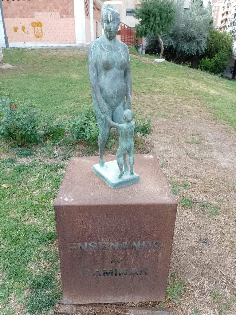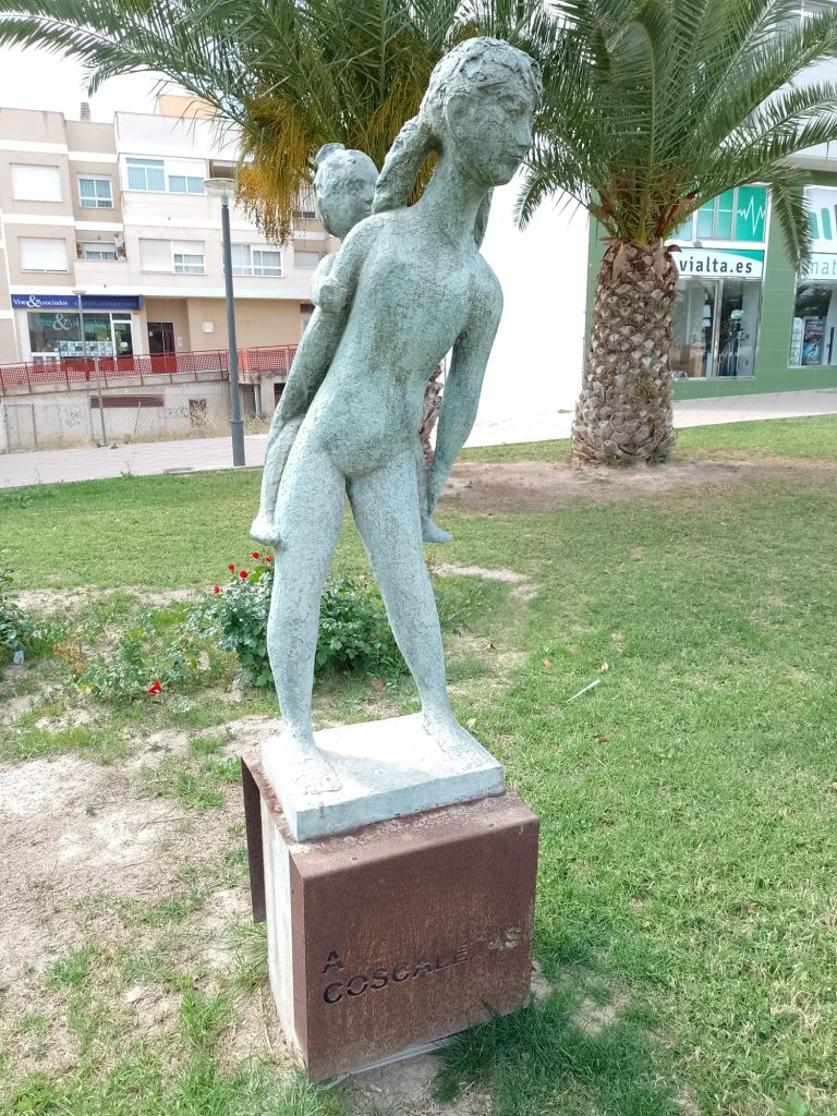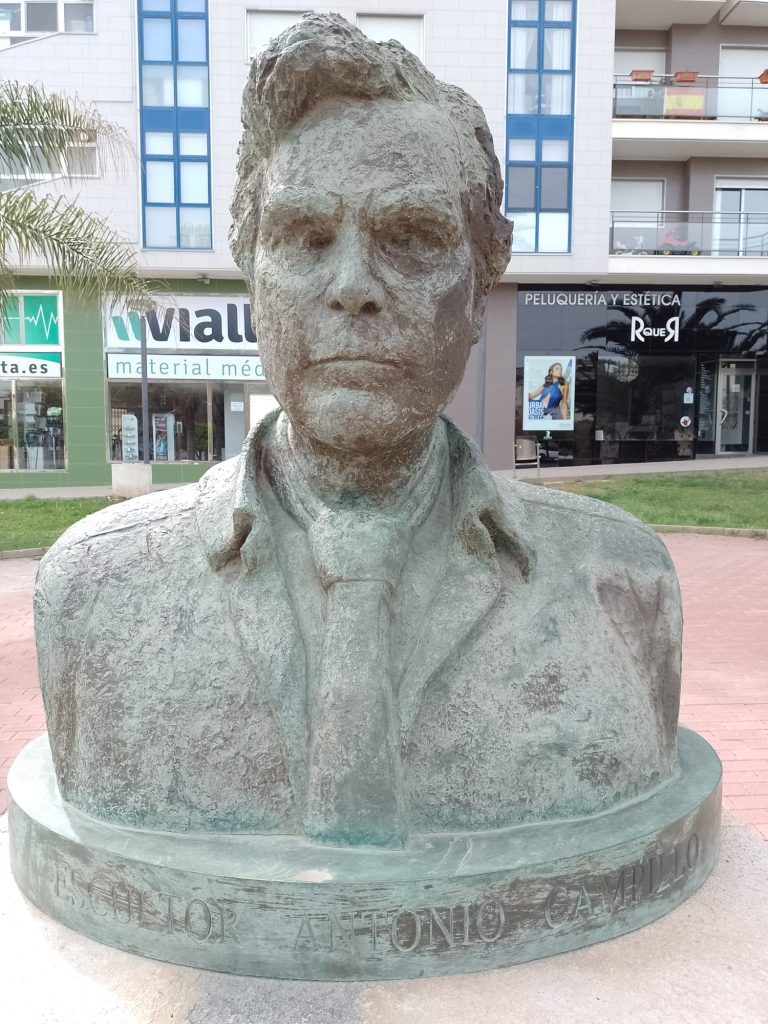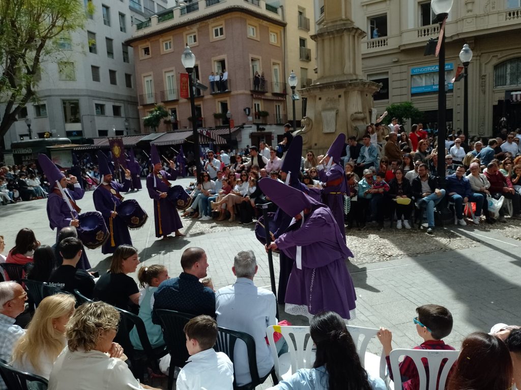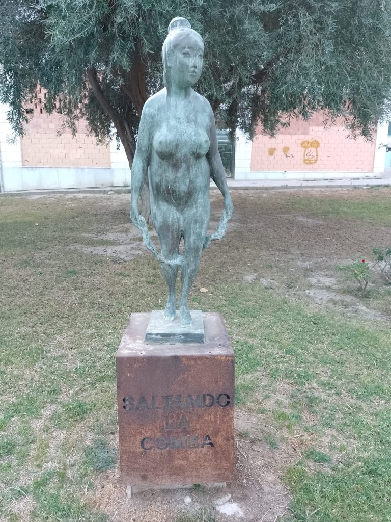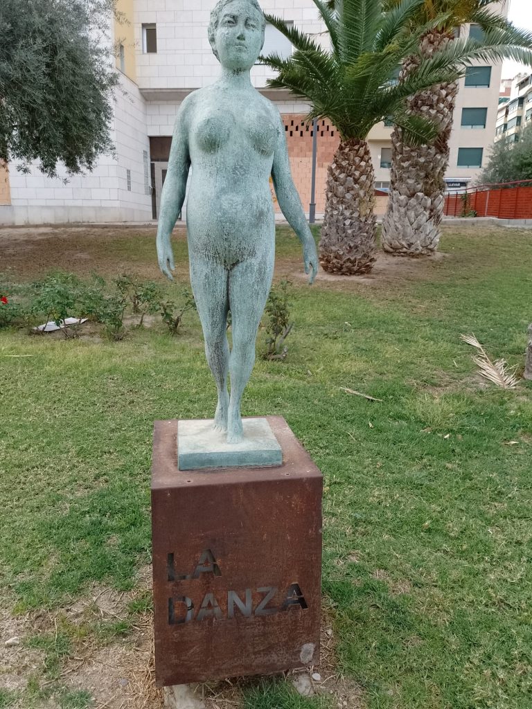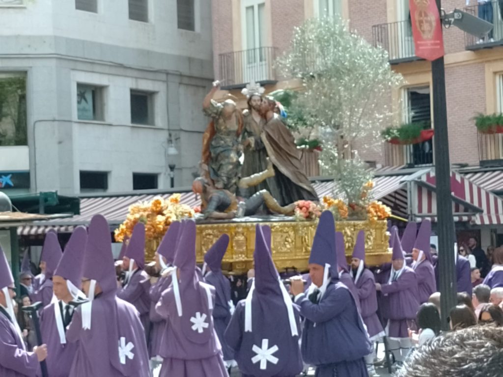 Goede vrijdag: Onze bedoeling was om langs de Itineo dealer te fietsen om persoonlijk te informeren of zij een koplamp voor ons kunnen bestellen (in die van ons zit een gat….). We hebben al mailcontact gehad maar de laatste twee dagen niets meer gehoord. Echter, volgens onze Nederlandse buurman op de camperplaats is goede vrijdag een feestdag (lees vrije dag) voor de Spanjaarden en is alles gesloten. Zelfs de Ikea op dit gigantische plein is gesloten en dat schijnt echt een bijzonderheid te zijn. Ik heb op internet gelezen dat vanaf Palmpasen tot Pasen (deze week wordt Semana Santa genoemd) er in heel Spanje veel processies gehouden worden. Er is er vanmorgen ook een dus in plaats van naar de dealer, fietsen we naar het centrum. We vallen met onze neus in de boter want het is gigantisch druk in de stad en de processie is nog in volle gang. We gaan op een paar plaatsen kijken en verbazen ons over de vele in het paars geklede mannen, vrouwen en kinderen die in de processie meelopen. we zien beeldengroepen die op vergulde platformen (paso’s) worden rondgedragen. Overal langs de route staan stoeltjes die je, zo horen we later, kunt huren voor de duur van de processie. Zo’n stoeltje is ook geen overbodige luxe want de processie gaat langzaam, erg langzaam en duurt dus vele uren. De processie van vandaag is al bij zonsopgang begonnen en is om half twee als wij weer richting camper gaan, nog lang niet afgelopen. Onderweg komen we nog langs het Antonio Campillo sculpture park, hier zien we bijzondere beelden. Antonio Campillo is een van de bekendste beeldhouwers uit de regio en heeft een groot aantal beelden gemaakt die je door heel Murcia kunt bewonderen.