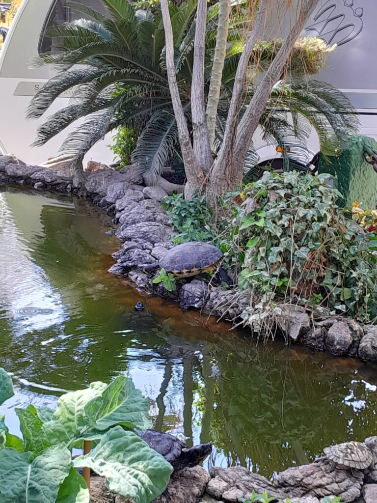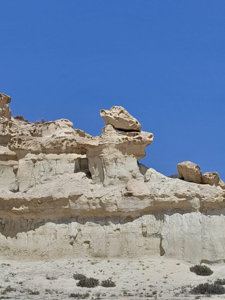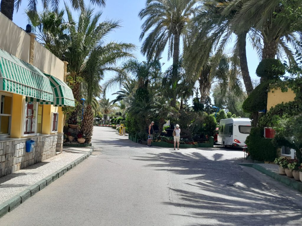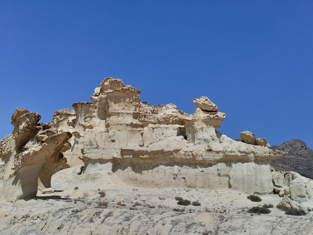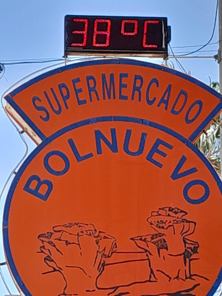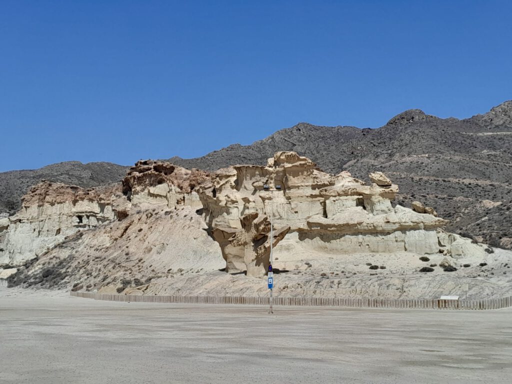 Heerlijke zonnige dag vandaag. We zijn op ons gemak langs het strand naar “Las Gredas” de rotsformatie in Bolnuevo gelopen. In dit district Mazarrón wordt een van de belangrijkste symbolen van de gemeente gevonden: de geologische formaties die bekend staan als “Las Gredas” of “De betoverde stad”, met rotspaddenstoelen van enkele meters hoog en een rotswand gemodelleerd met soortgelijke vormen. De rotsen zien er heel bijzonder uit en het is echt de moeite om er even te gaan kijken als je in de buurt bent. Het is wel erg warm in de zon en we puffen even uit in de schaduw. We lopen weer terug door het dorp en halen bij de supermarkt een stokbroodje voor de lunch. Ik draai nog even een wasje zodat we weer een poosje vooruit kunnen met de schone kleren en verder genieten we van het heerlijke weer. André en Skip duiken de zee nog even in maar komen daar snel van terug. Er zwemmen kwallen en daar kom je liever niet mee in aanraking. Vandaar wel veel mensen op het strand maar niemand in de zee. Het zwembad op de camping is een goed alternatief althans voor André, niet voor Skip natuurlijk.