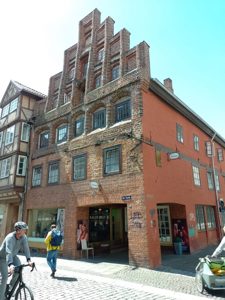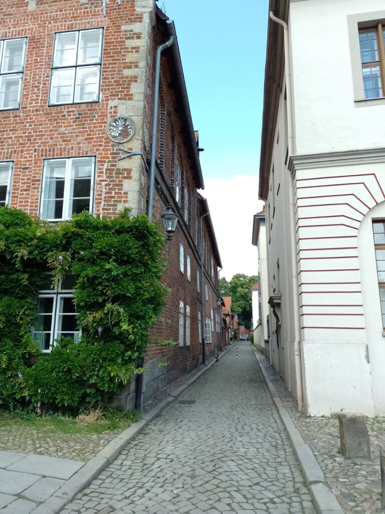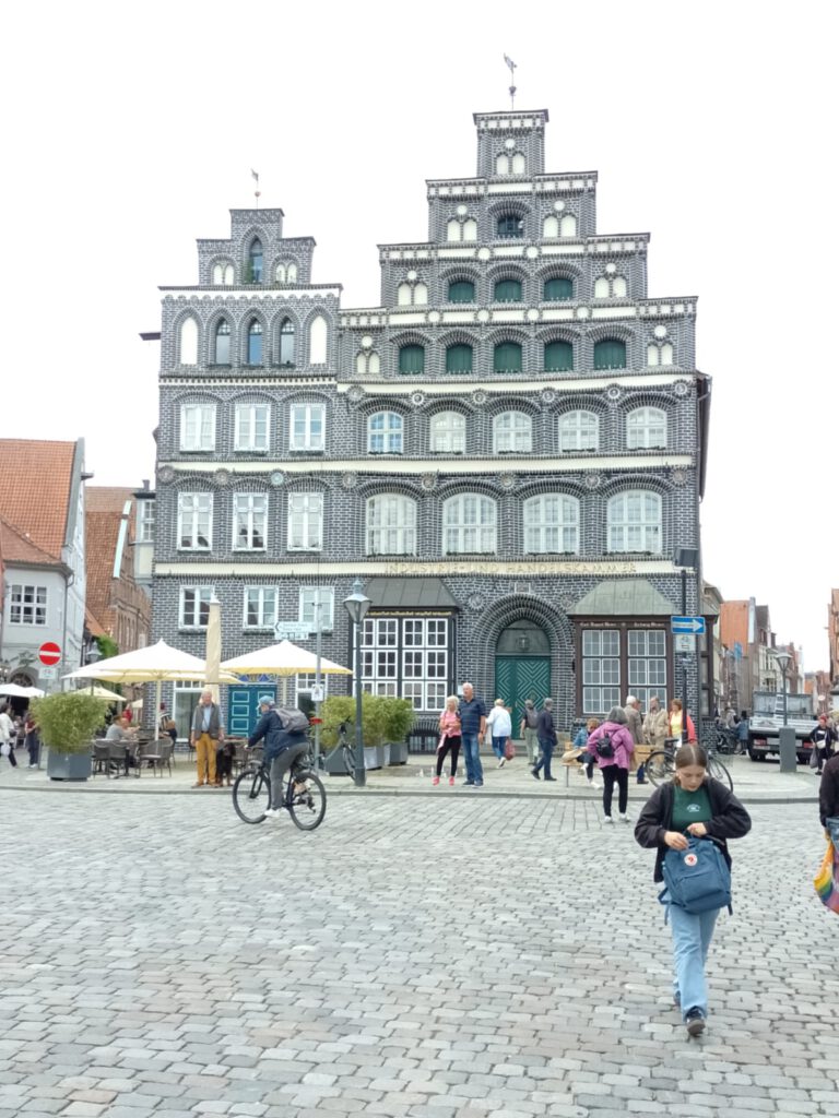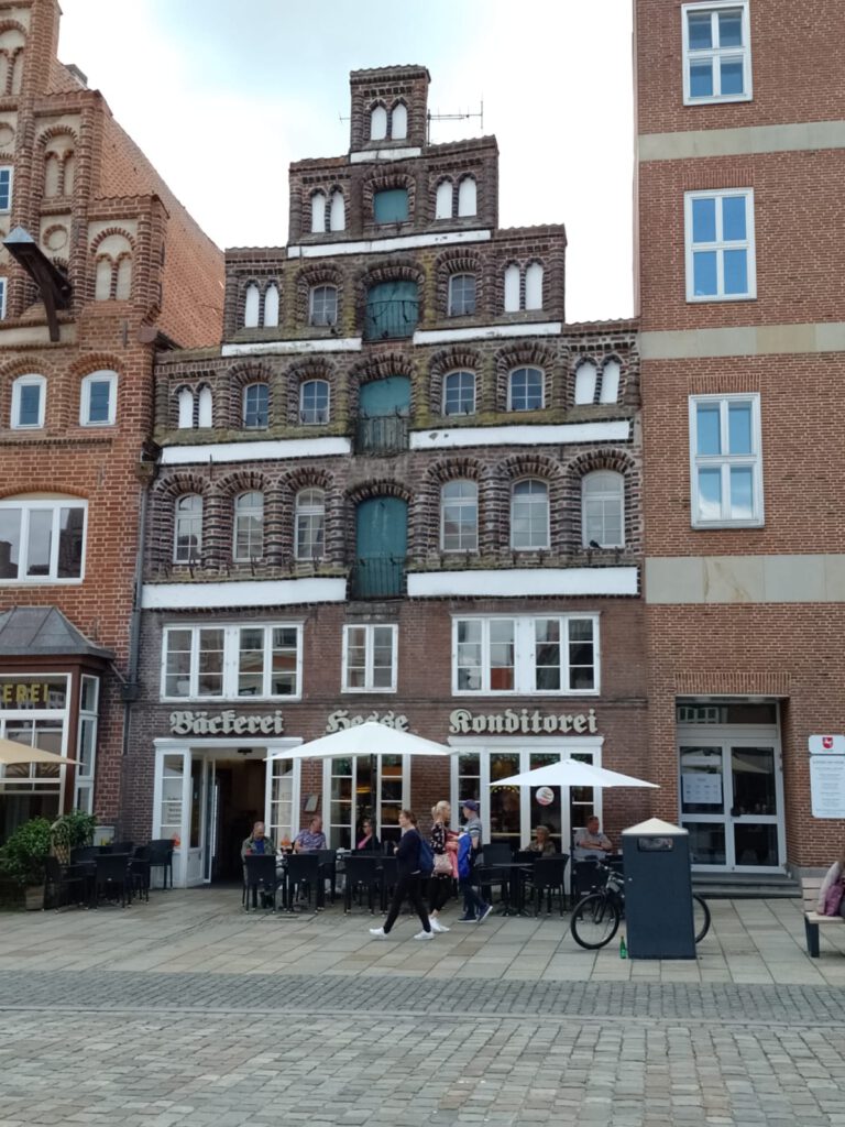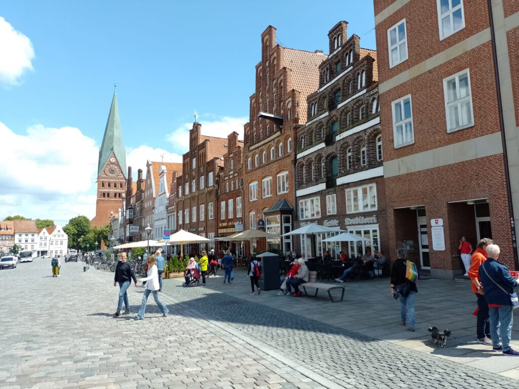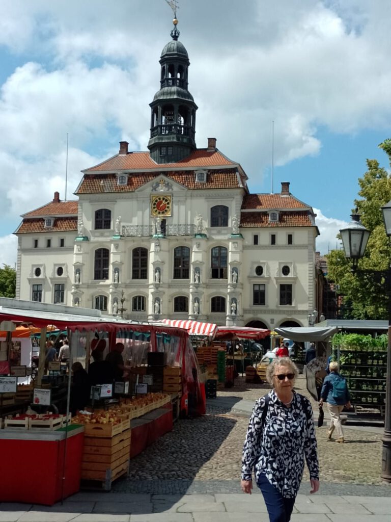 Precies volgens buienradar is het vanmorgen net na zeven uur droog. Het lijkt erop dat het de rest van de dag droog blijft dus we blijven hier nog een dag. Na het ontbijt halen we de fietsen uit de camper en fietsen naar de scheepslift, dat gaat een stuk sneller dan lopen zoals gisteren. We hebben geluk want er is net een groot containerschip in de bovenste bak gevaren. André blijft boven staan kijken en ik loop snel naar beneden (net 200 treden omhoog gelopen en nu dus weer naar beneden) om beneden een filmpje te maken. Het duurt een poosje voor de bak naar beneden komt maar als hij eenmaal gaat zakken dan gaat het ook best snel. Als het containerschip weer uit de bak vaart varen er twee plezierbootjes in die omhoog gehesen moeten worden. Leuk om te zien hoor. Helaas zijn alle filmpjes een beetje bibberig geworden, te slecht om te laten zien. Maar he, het idee was wel leuk natuurlijk. Daarna zijn we op ons gemak langs het kanaal naar Lunenburg gefietst. Leuke stad met hele mooie gebouwen. Wel druk ook maar daar houden wij wel van. We bewonderen twee van de vier kerken en slenteren door smalle straatjes en over de markt voor het stadhuis. Overal zien we de mooiste geveltjes veel te veel om van al die gevels foto’s te maken want dan hebben we niet genoeg opslagcapaciteit op onze telefoons :-). We drinken wat op een terrasje in het zonnetje en genieten later op een bankje van een lekkere braadworst. Na nog een rondje door het centrum fietsen we weer terug naar de camperplaats in Adendorf en zitten daar de rest van de middag heerlijk in de zon. Duimen dat de regen nu echt eens een keer weg blijft voorlopig.