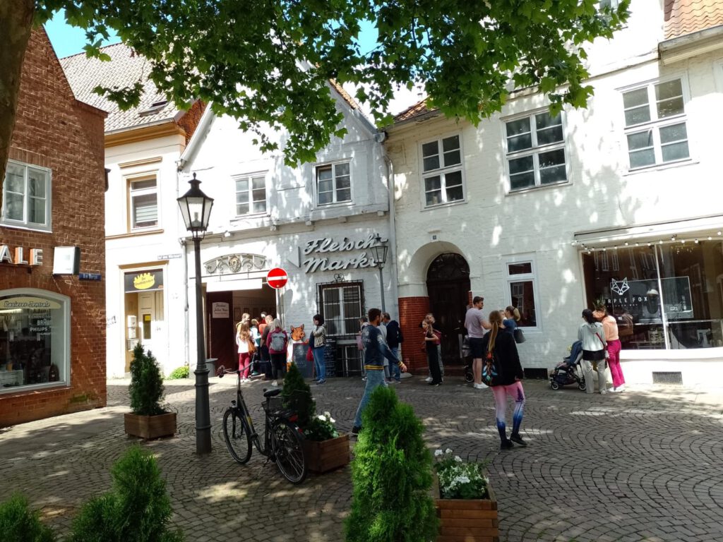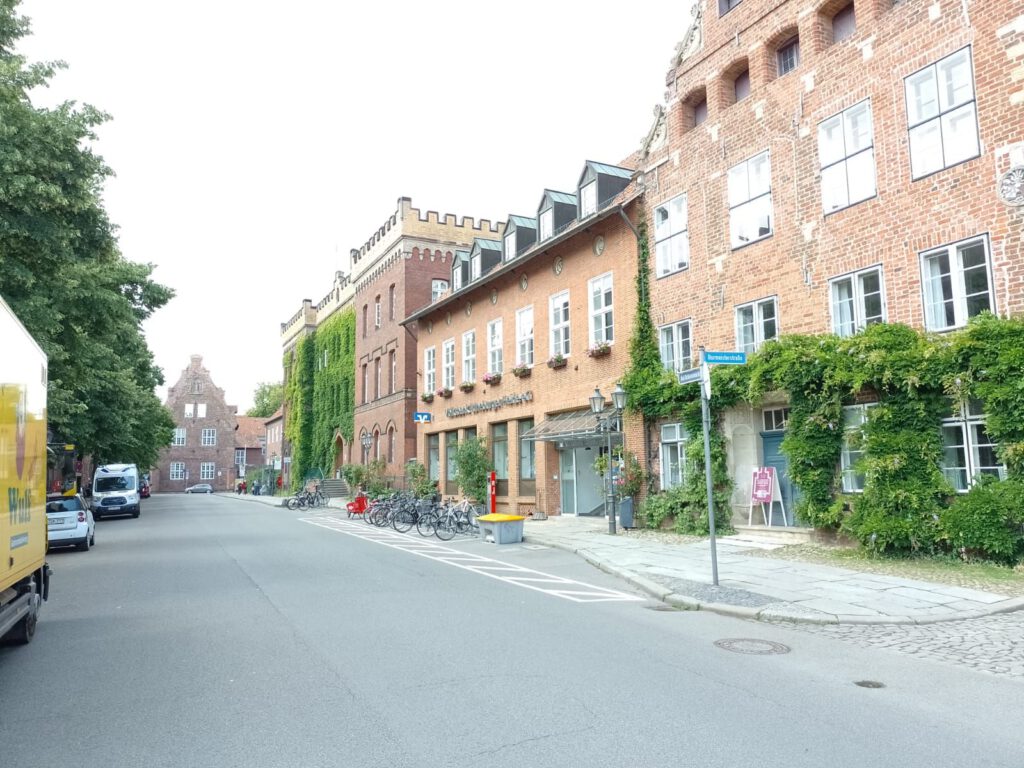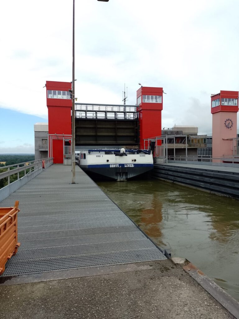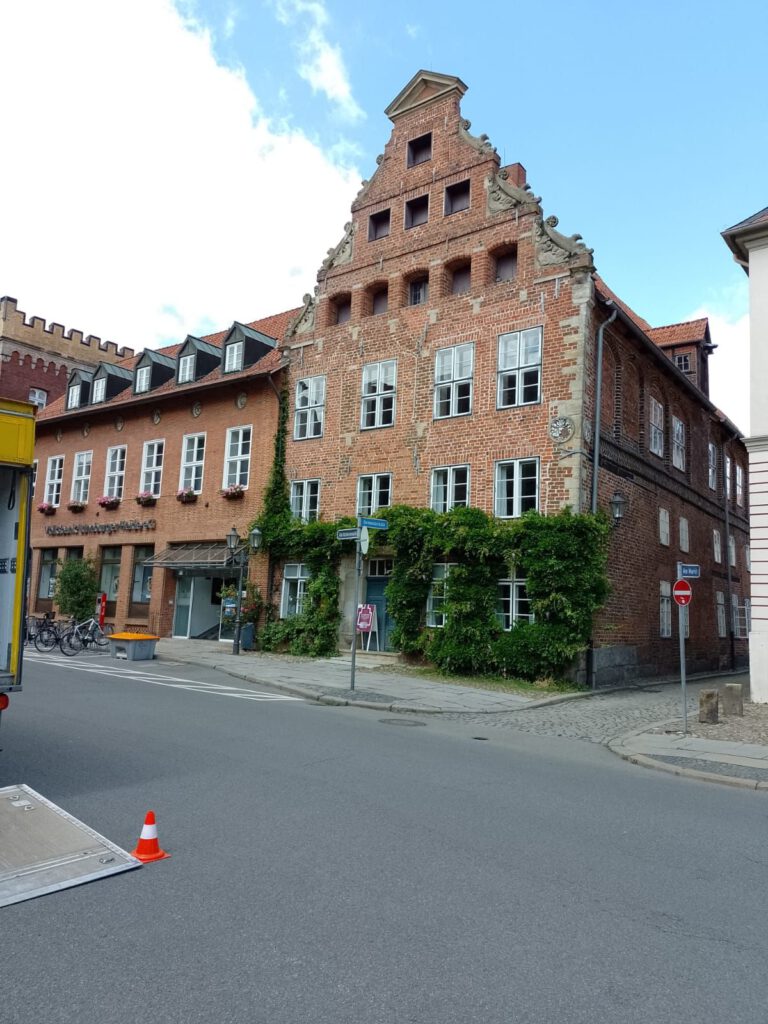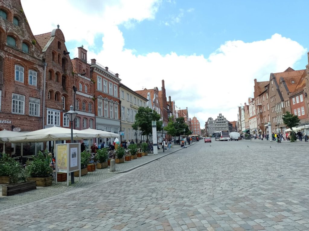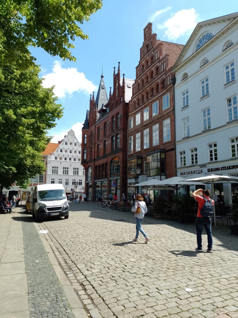 Precies volgens buienradar is het vanmorgen net na zeven uur droog. Het lijkt erop dat het de rest van de dag droog blijft dus we blijven hier nog een dag. Na het ontbijt halen we de fietsen uit de camper en fietsen naar de scheepslift, dat gaat een stuk sneller dan lopen zoals gisteren. We hebben geluk want er is net een groot containerschip in de bovenste bak gevaren. André blijft boven staan kijken en ik loop snel naar beneden (net 200 treden omhoog gelopen en nu dus weer naar beneden) om beneden een filmpje te maken. Het duurt een poosje voor de bak naar beneden komt maar als hij eenmaal gaat zakken dan gaat het ook best snel. Als het containerschip weer uit de bak vaart varen er twee plezierbootjes in die omhoog gehesen moeten worden. Leuk om te zien hoor. Helaas zijn alle filmpjes een beetje bibberig geworden, te slecht om te laten zien. Maar he, het idee was wel leuk natuurlijk. Daarna zijn we op ons gemak langs het kanaal naar Lunenburg gefietst. Leuke stad met hele mooie gebouwen. Wel druk ook maar daar houden wij wel van. We bewonderen twee van de vier kerken en slenteren door smalle straatjes en over de markt voor het stadhuis. Overal zien we de mooiste geveltjes veel te veel om van al die gevels foto’s te maken want dan hebben we niet genoeg opslagcapaciteit op onze telefoons :-). We drinken wat op een terrasje in het zonnetje en genieten later op een bankje van een lekkere braadworst. Na nog een rondje door het centrum fietsen we weer terug naar de camperplaats in Adendorf en zitten daar de rest van de middag heerlijk in de zon. Duimen dat de regen nu echt eens een keer weg blijft voorlopig.
