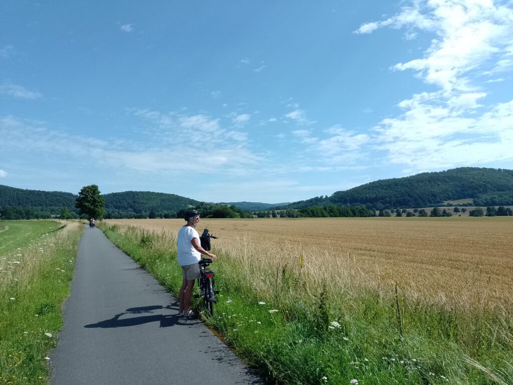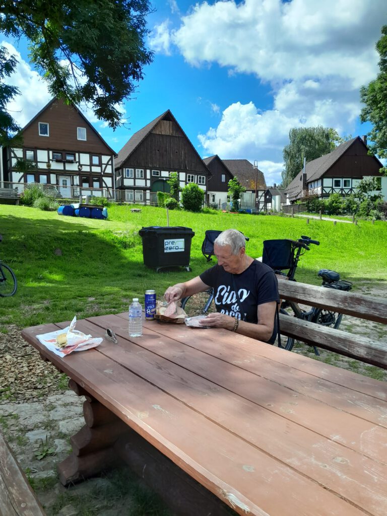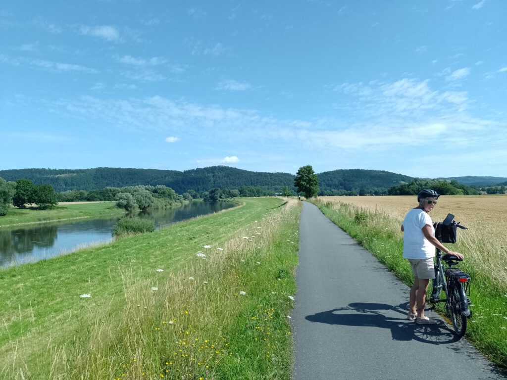 We hebben rustig geslapen op dit gratis camperplaatsje. De zon schijnt alweer volop dus we gaan weer fietsen vandaag. Deze keer beginnen we aan de andere kant van de Wezer. Het is heerlijk rustig fietsen langs het water, wel jammer dat er geen bankjes staan. Gisteren waren de bankjes niet te tellen zoveel en nu bijna geen een. Na een kilometer of veertien komen we bij een pontje. We worden voor € 1,50 netjes naar de overkant gebracht en fietsen daar weer verder aan de andere kant van het water. We halen lekkere broodjes bij de supermarkt en eten die onderweg op bij een cafeetje aan het water dat vandaag gesloten is. Na een paar kilometer blijkt een stuk van de route weer over dat steile pad te gaan 😕, dat slaan we maar over 🙂. Na precies 27 kilometer zijn we weer bij de camper. We gaan lekker buiten zitten en maken het ons met eten lekker makkelijk met een bakje uit de diepvries. Een dag met een gouden randje.
