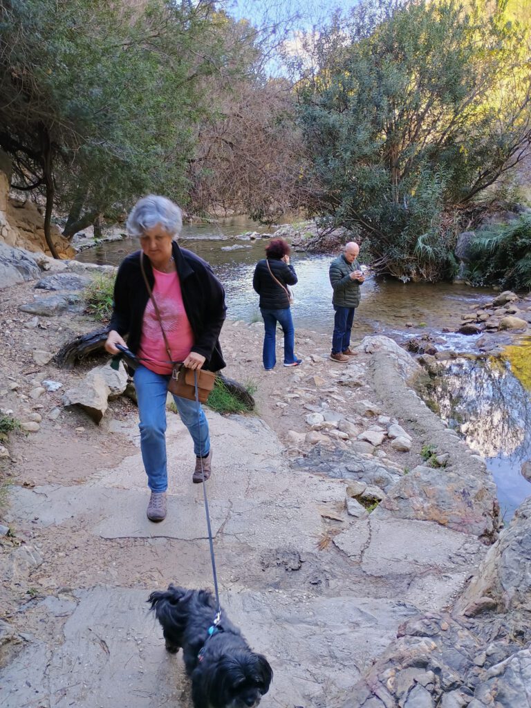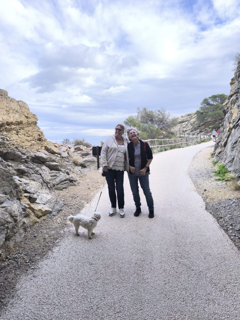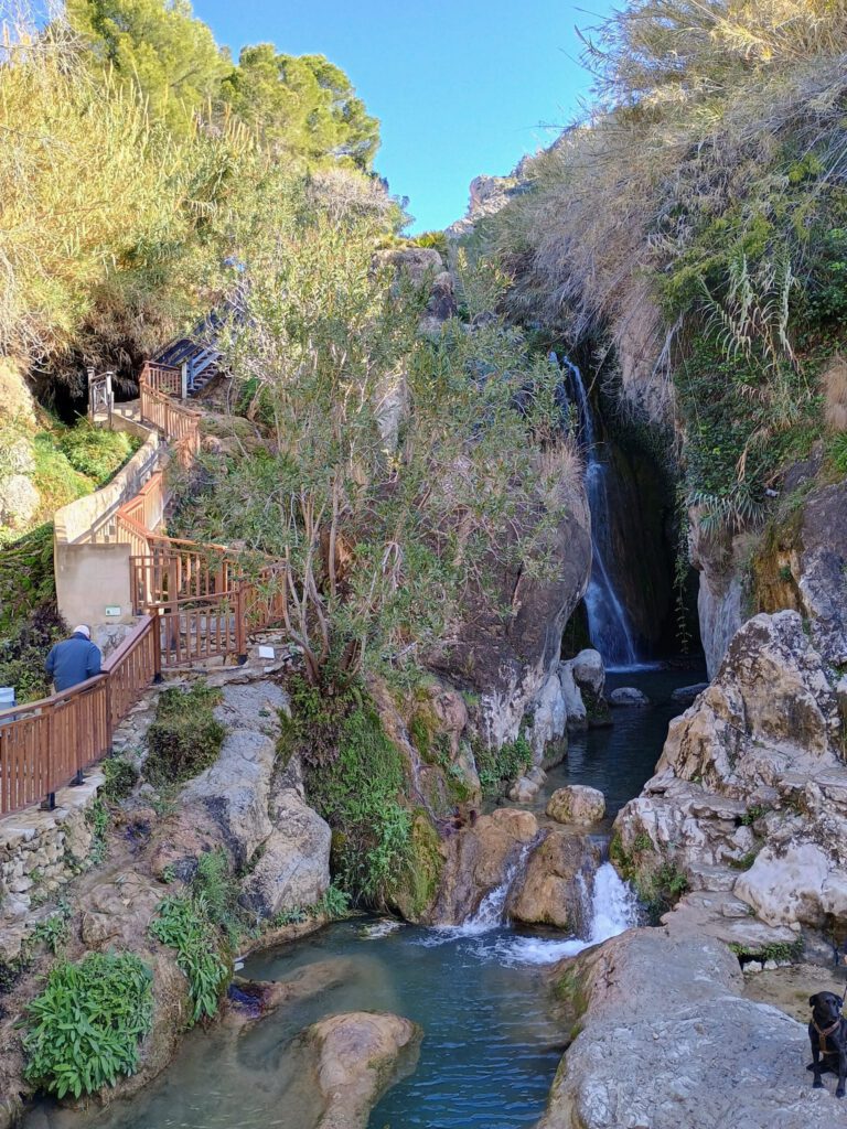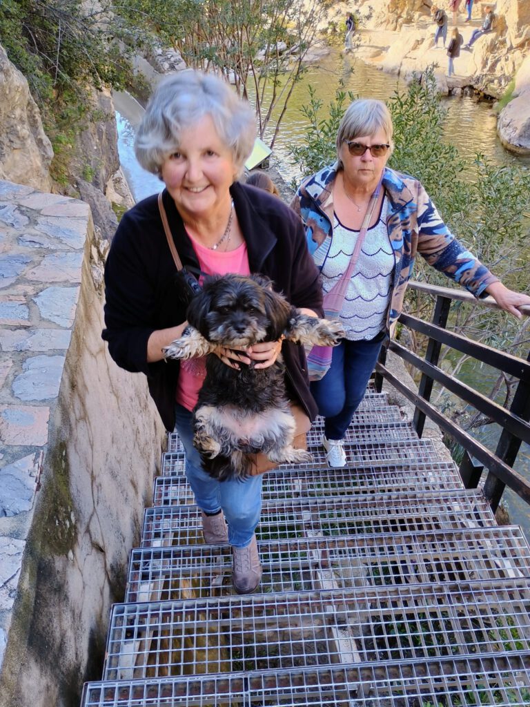 Zondag zijn we met z’n vieren (met de auto) naar de watervallen van Algar geweest. Leuk hoor, wel hele steile trappen, pffft daar had ik wel even moeite mee. Een gedeelte van de trappen was van ijzer waar Skip niet overheen kon lopen. Die moest soms even gedragen worden, dat vond ze wel heel spannend, kijk maar eens naar de foto. Ik heb haar een beetje raar vast maar dat is omdat ze drijfnat was. Het was een beetje jammer dat de zon net aan de verkeerde kant van de berg scheen, zo lijkt het op de foto’s of het somber weer is maar niets is minder waar, de zon schijnt volop alleen net nietwaar wij lopen. Na afloop pakken we nog even een terrasje en dan gaat het weer terug naar de camping. Onderweg komen in Polop en La Nucia een grote (rommel)markt tegen. Gelukkig rijdt Roland gewoon door, althans gelukkig voor mij, André vindt het erg jammer en had graag een bezoekje aan de markt gebracht. We schrijven het op de lijst voor volgend jaar :-). Onderweg komen er steeds meer dreigende donkere wolken in de lucht maar eenmaal op de camping zijn ze weer verdwenen. Kan ik nog mooi een wasje draaien zodat alles morgen als we hier weer vertrekken schoon is. We hebben een superleuke week hier op de camping in Benidorm gehad. Volgend jaar weer!