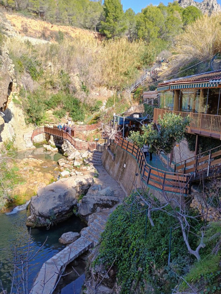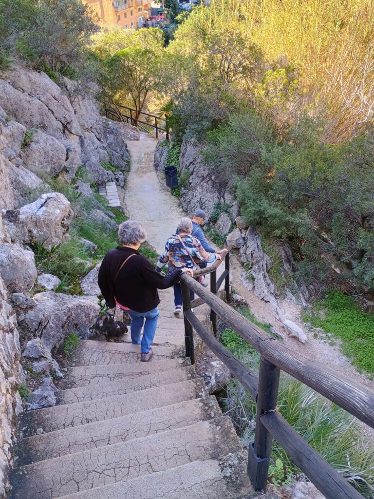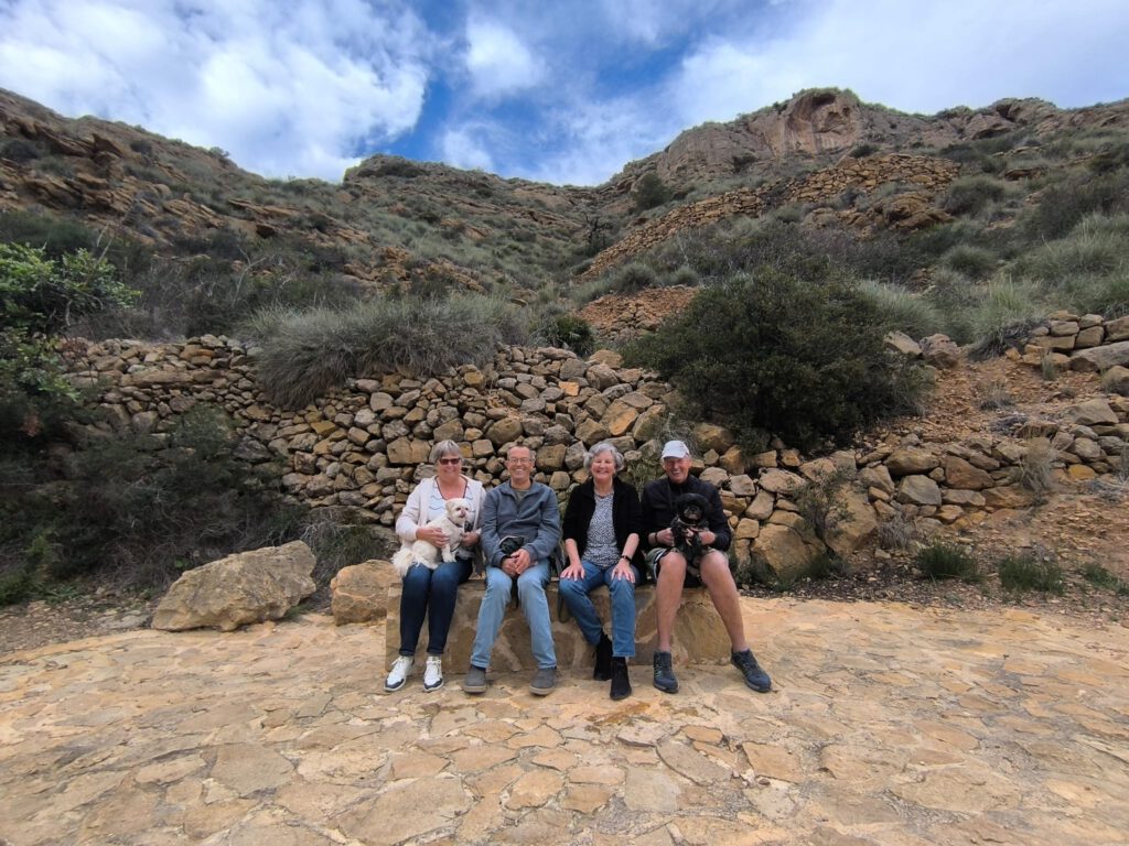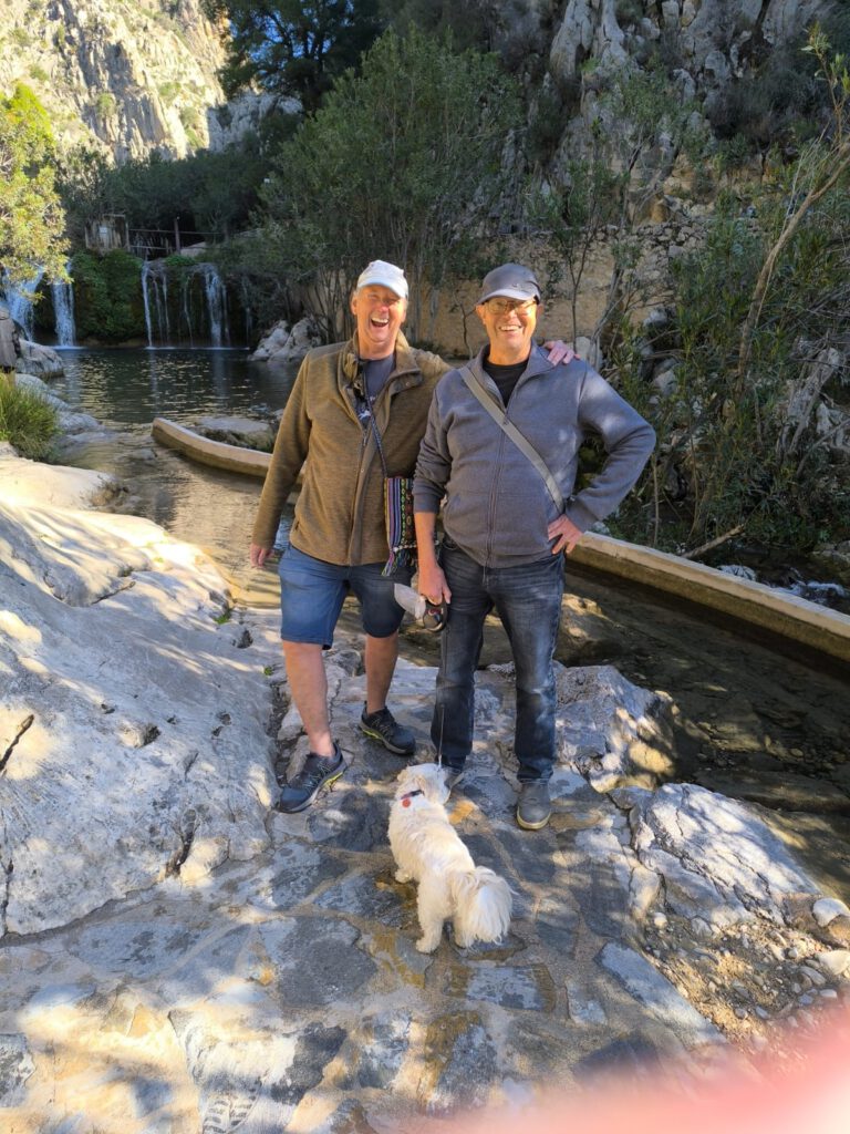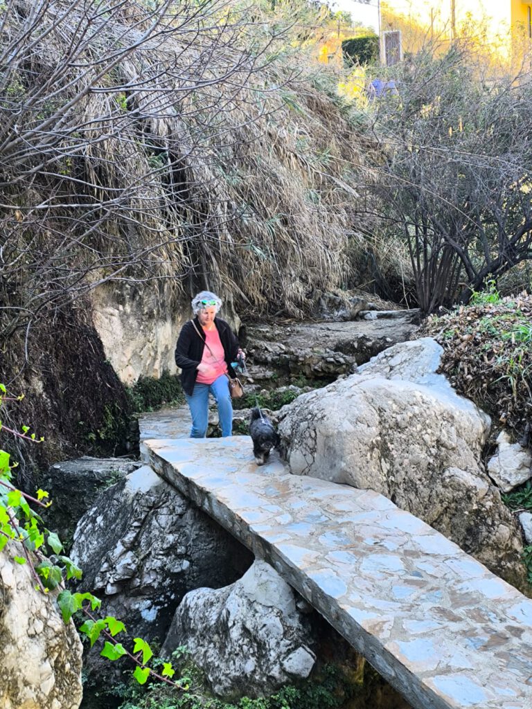 Zondag zijn we met z’n vieren (met de auto) naar de watervallen van Algar geweest. Leuk hoor, wel hele steile trappen, pffft daar had ik wel even moeite mee. Een gedeelte van de trappen was van ijzer waar Skip niet overheen kon lopen. Die moest soms even gedragen worden, dat vond ze wel heel spannend, kijk maar eens naar de foto. Ik heb haar een beetje raar vast maar dat is omdat ze drijfnat was. Het was een beetje jammer dat de zon net aan de verkeerde kant van de berg scheen, zo lijkt het op de foto’s of het somber weer is maar niets is minder waar, de zon schijnt volop alleen net nietwaar wij lopen. Na afloop pakken we nog even een terrasje en dan gaat het weer terug naar de camping. Onderweg komen in Polop en La Nucia een grote (rommel)markt tegen. Gelukkig rijdt Roland gewoon door, althans gelukkig voor mij, André vindt het erg jammer en had graag een bezoekje aan de markt gebracht. We schrijven het op de lijst voor volgend jaar :-). Onderweg komen er steeds meer dreigende donkere wolken in de lucht maar eenmaal op de camping zijn ze weer verdwenen. Kan ik nog mooi een wasje draaien zodat alles morgen als we hier weer vertrekken schoon is. We hebben een superleuke week hier op de camping in Benidorm gehad. Volgend jaar weer!