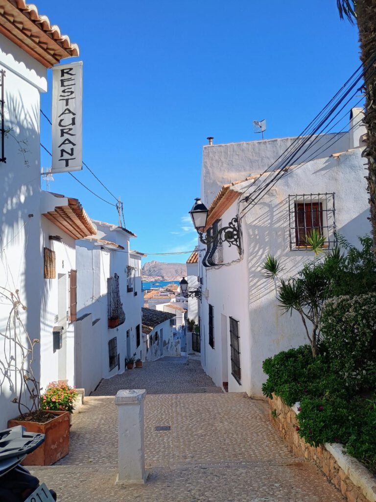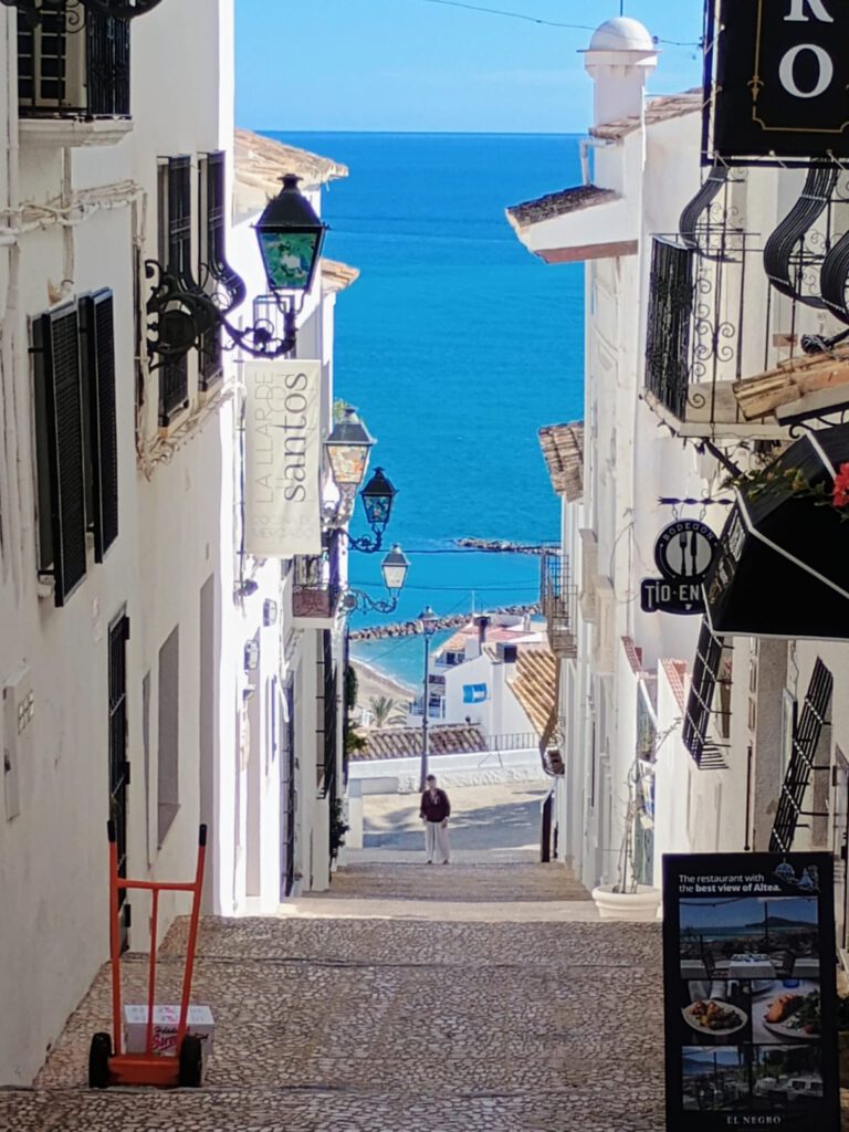 Donderdag brengen we (weer met z’n viertjes) een bezoekje aan oud Altea. Wij wilden er op de fiets heen maar om oud Altea te bezoeken moet je wel heel ver omhoog fietsen/lopen. Dat gaat met de auto van Roland en Marja een stuk makkelijker :-), zeker de helft van de klim hebben we zo overgeslagen. Oud Altea heeft heel leuke doorkijkjes met zeezicht, smalle steegjes en vooral heel veel trapjes. Behalve dat ook een hele mooie kerk de Nuestra Señora del Consuelo, Deze parochiekerk, daterend begin 20ste eeuw, is zowat het symbool van Altea. Logisch, vanwege de hogere ligging en de opvallende blauwe koepels met witte decoratie, eist het de volledige aandacht op. Een charmante parochie die het bezichtigen waard is. We hebben zelden zo’n mooie goed onderhouden kerk gezien. Als je in de buurt bent is het zeker de moeite waard om Altea te bezoeken.