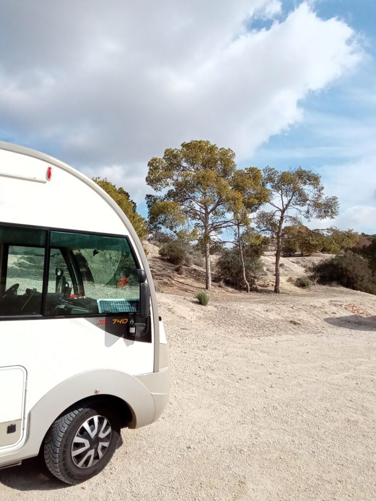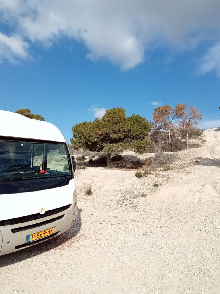 Vanmorgen werden we wakker van het verkeer dat over de weg recht achter ons raasde. Althans het lijkt alsof ze heel hard rijden maar misschien valt dat wel mee. In het donker klinken de geluiden veel harder natuurlijk. Gelukkig kwam er een plaatsje vrij op de eerste rij zodat we een eindje van de weg afstonden en een prachtig uitzicht over de zee. We besloten om hier nog twee dagen te blijven staan. Helaas dat feest ging niet door, André stond net even buiten zijn sociale contacten te onderhouden toen de politie het terrein op kwam rijden. Iedereen moest vertrekken, alle kentekens werden genoteerd en gefotografeerd. Een van de agenten vertelde dat ze in de flat naast de camperplaats woonde en al tijden zag dat veel camperaars hier al heel lang stonden en hun zwarte water (wc dus) ’s nachts aan de overkant van de weg tussen de struiken dumpten. Weer een staaltje van een paar camperaars die het verpesten voor vele anderen die zich wel aan de regels houden. Jammer hoor, we stonden net zo mooi. Eerst nog even koffie gedronken en toen maar vertrokken richting Elx/Elche, hier hebben we vorig jaar ook gestaan en dat beviel goed. De hele middag lekker in de zon gezeten tot er ineens een spanjaard behoorlijk hard aan kwam rijden en zijn auto rakelings langs onze stoeltjes parkeerde. Hij beweerde dat we hier niet mochten staan en een stuk verderop moesten gaan staan. Vervolgens haalt hij twee tassen eten en een paar stoeltjes uit zijn auto en gaat pontificaal voor zijn auto zitten. Hij blijft regelmatig boos gebaren dat wij hier weg moeten. De eerste tijd denken we ‘zoek het maar uit’ maar als hij er anderhalf uur later nog is en nog steeds rondloopt te gebaren dat we weg moeten wezen kiezen we toch maar eieren voor ons geld en gaan een stukje verderop staan. Je weet maar nooit wat zo’n man doet als het straks donker is. Het andere plekje is ook prima en het is inmiddels toch te koud om buiten te zitten dus maakt het ook niet meer waar we staan. Nu maar hopen dat we niet weer weggestuurd worden. We staan hier net als afgelopen nacht niet alleen en denken maar dat gedeelde smart halve smart is. We gaan het zien.