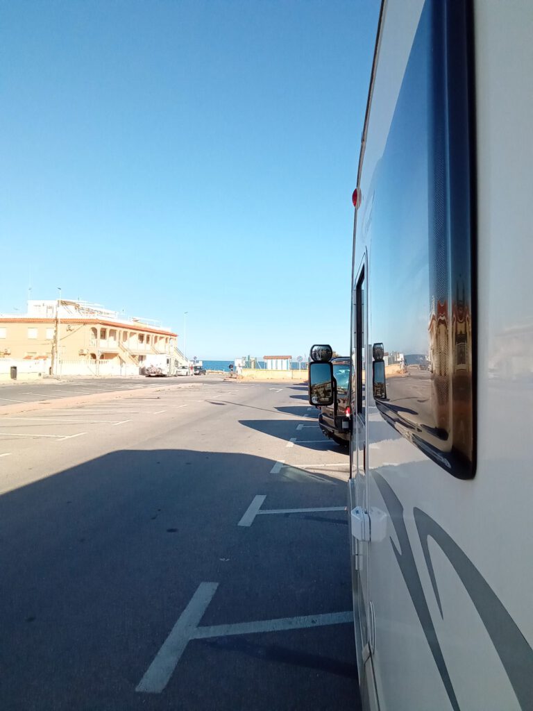 Drukke dag vandaag eerst rondje gelopen in het winkelcentrum, het is echt enorm groot. La Zenia Boulevard is het grootste winkelcomplex in openlucht binnen Europa. Dat wilden wij wel eens zien natuurlijk. Na ons rondje door het winkelcentrum hebben we Skip even opgehaald in de camper en zijn naar de enorme PetsPlace gelopen om te vragen of zij daar Skip wilden knippen. Helaas, het meisje dat de trimsalon beheert blijkt net op vakantie. Weer terug in de camper zoek ik op internet waar een wasserette is en rijden we eerst daar naar toe. Terwijl de was in de machine zit kunnen wij mooi even lunchen. Na een kleine anderhalf uur is alle was weer schoon en kunnen we even boodschappen gaan doen bij onze huisleverancier de Lidl. Vanaf daar is het gelukkig nog maar een klein stukje naar de camperplaats waar we naar toe willen. Dit is eigenlijk gewoon een parkeerplaats maar hij ligt wel recht aan zee en aangezien het lekker warm is vandaag is dat natuurlijk wel erg fijn. Op dit plekje zijn we op onze eerste overwinterreis ook geweest maar we hadden er nooit meer aan gedacht tot we er gisteren op de fiets langs kwamen. Als het weer een beetje meezit blijven we hier een paar dagen.