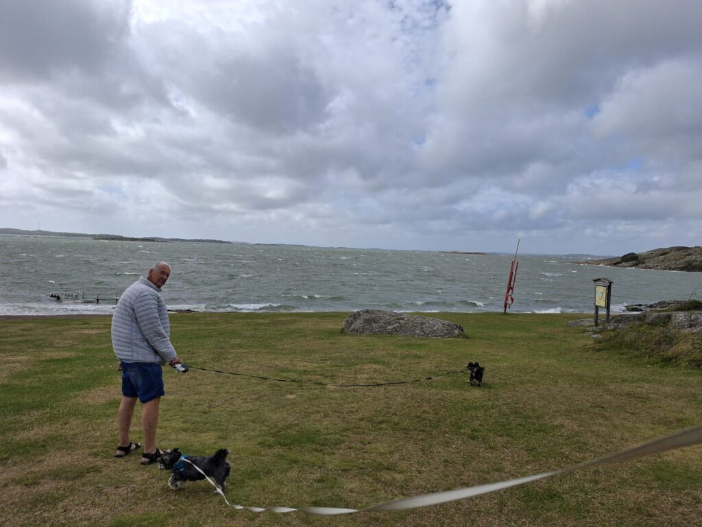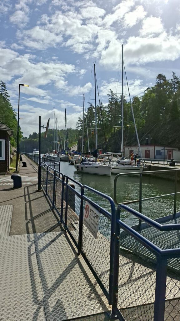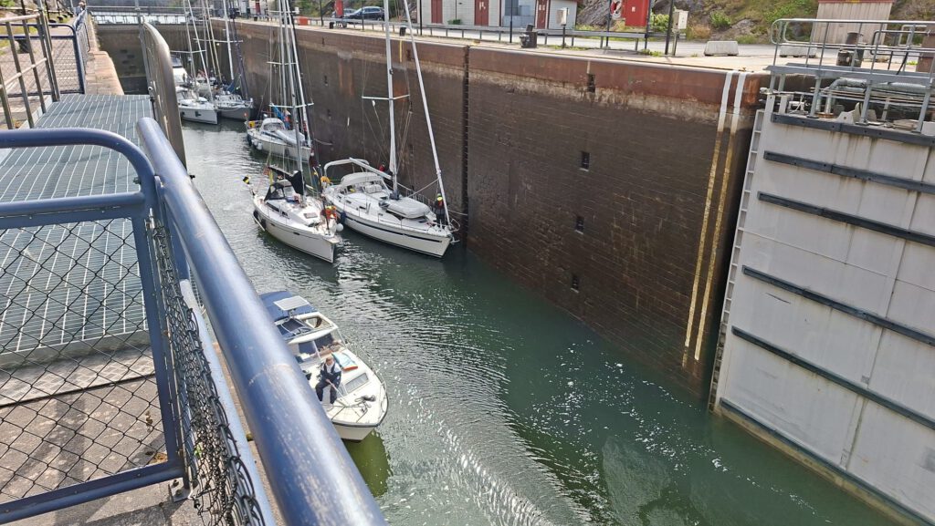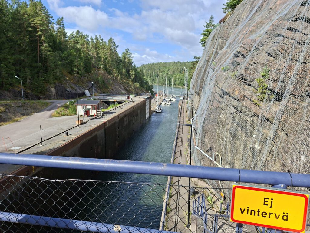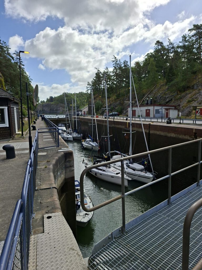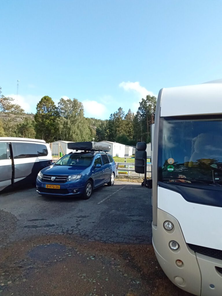Vandaag staat er weer een reisdag(je) op de planning. We vertrekken wel een beetje later dan de planning want Marijke ziet ineens dat er nu een aantal boten voor de sluis liggen en dat moet ze natuurlijk even filmen en fotograferen. Het is een mooi gezicht en omdat de boten met de sluizen naar beneden gaan gaat het schutten best snel maar voor alle boten, een stuk of acht allemaal in de sluis lagen duurde het wel even. Maar, we hebben toch nog boten in de sluis gezien! Om een uur of elf vertrekken we van het mooie plekje in Trollhättan. Eerst even naar de Lidl voor de nodige boodschappen en dan door naar de camping. De camping valt wel erg tegen, de plek die we aangewezen krijgen is gewoon een parkeerplaats langs de weg, Marijke krijgt een plekje aan de andere kant van de camping ook precies naast de weg. Als we vragen of we bij elkaar mogen staan is dat geen probleem en mag Marijke bij ons op de camperplaats staan, die is ruim genoeg (dat dan weer wel) later vragen we of zij dan het geld van haar plekje terug kan krijgen, dat moet het meisje bij de receptie aan de baas navragen, wordt vervolgd. Het waait nog steeds verschrikkelijk dus van zwemmen komt niets maar een wandelingetje naar de zee maken we wel even. De omgeving hier is ook weer prachtig, dat maakt de vreselijke plek op de camping weer een beetje goed.