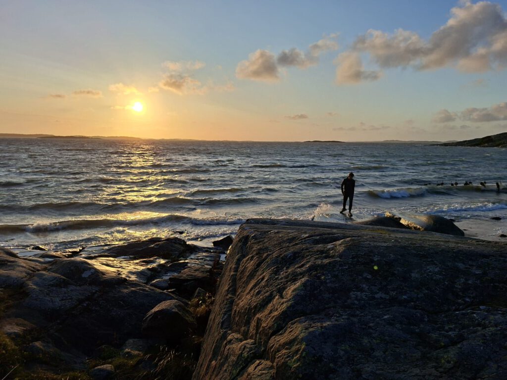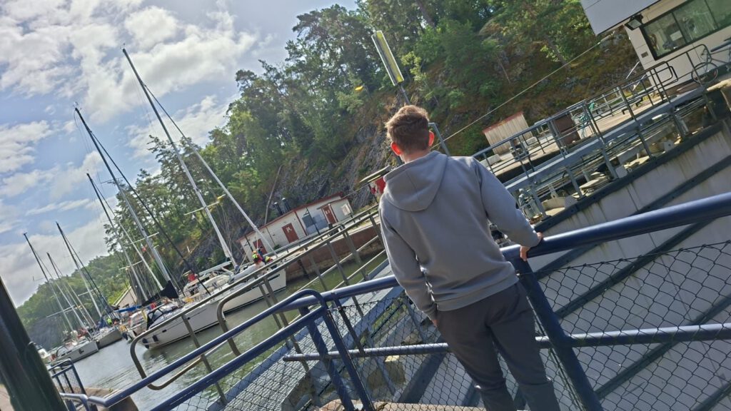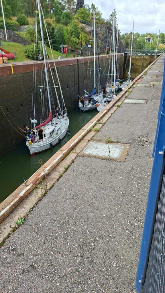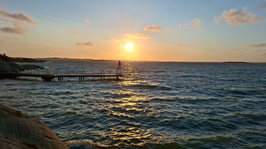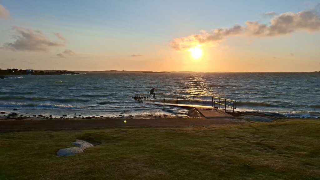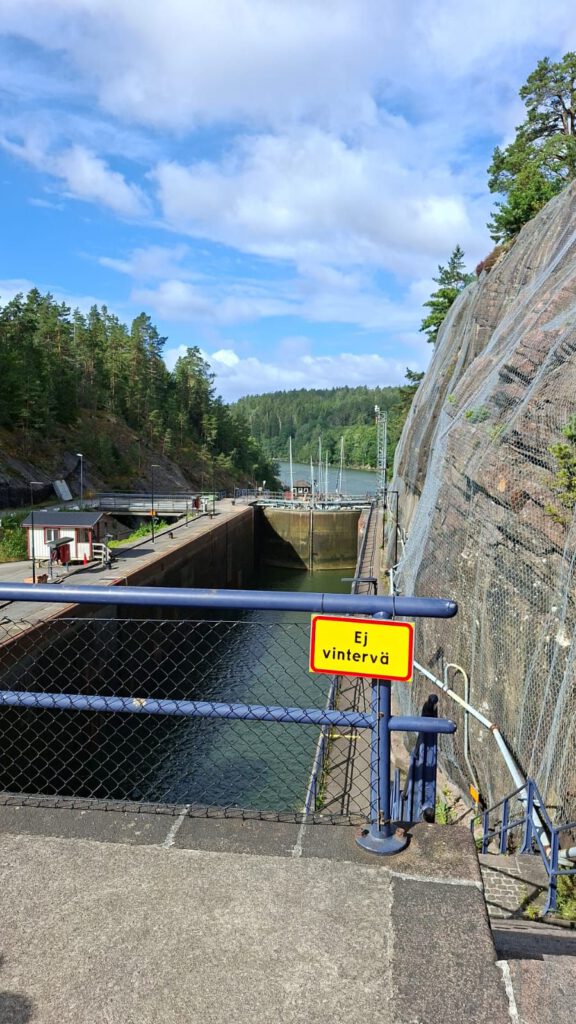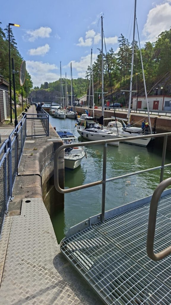 Vandaag staat er weer een reisdag(je) op de planning. We vertrekken wel een beetje later dan de planning want Marijke ziet ineens dat er nu een aantal boten voor de sluis liggen en dat moet ze natuurlijk even filmen en fotograferen. Het is een mooi gezicht en omdat de boten met de sluizen naar beneden gaan gaat het schutten best snel maar voor alle boten, een stuk of acht allemaal in de sluis lagen duurde het wel even. Maar, we hebben toch nog boten in de sluis gezien! Om een uur of elf vertrekken we van het mooie plekje in Trollhättan. Eerst even naar de Lidl voor de nodige boodschappen en dan door naar de camping. De camping valt wel erg tegen, de plek die we aangewezen krijgen is gewoon een parkeerplaats langs de weg, Marijke krijgt een plekje aan de andere kant van de camping ook precies naast de weg. Als we vragen of we bij elkaar mogen staan is dat geen probleem en mag Marijke bij ons op de camperplaats staan, die is ruim genoeg (dat dan weer wel) later vragen we of zij dan het geld van haar plekje terug kan krijgen, dat moet het meisje bij de receptie aan de baas navragen, wordt vervolgd. Het waait nog steeds verschrikkelijk dus van zwemmen komt niets maar een wandelingetje naar de zee maken we wel even. De omgeving hier is ook weer prachtig, dat maakt de vreselijke plek op de camping weer een beetje goed.