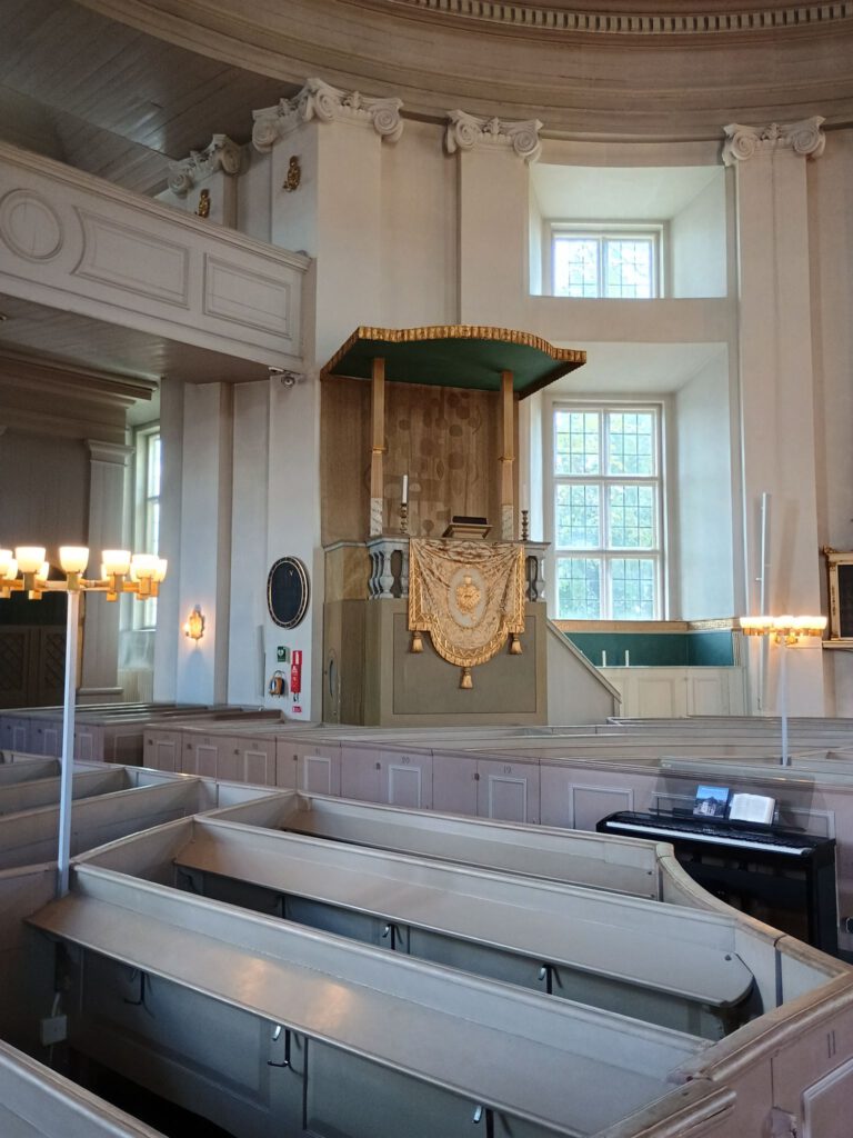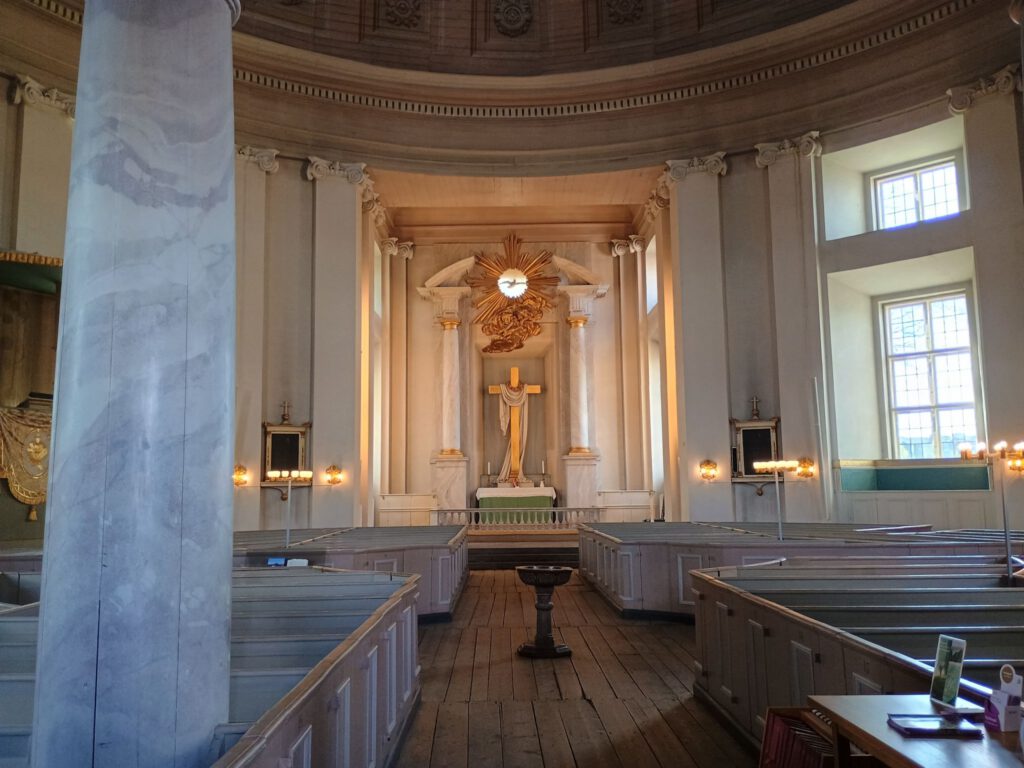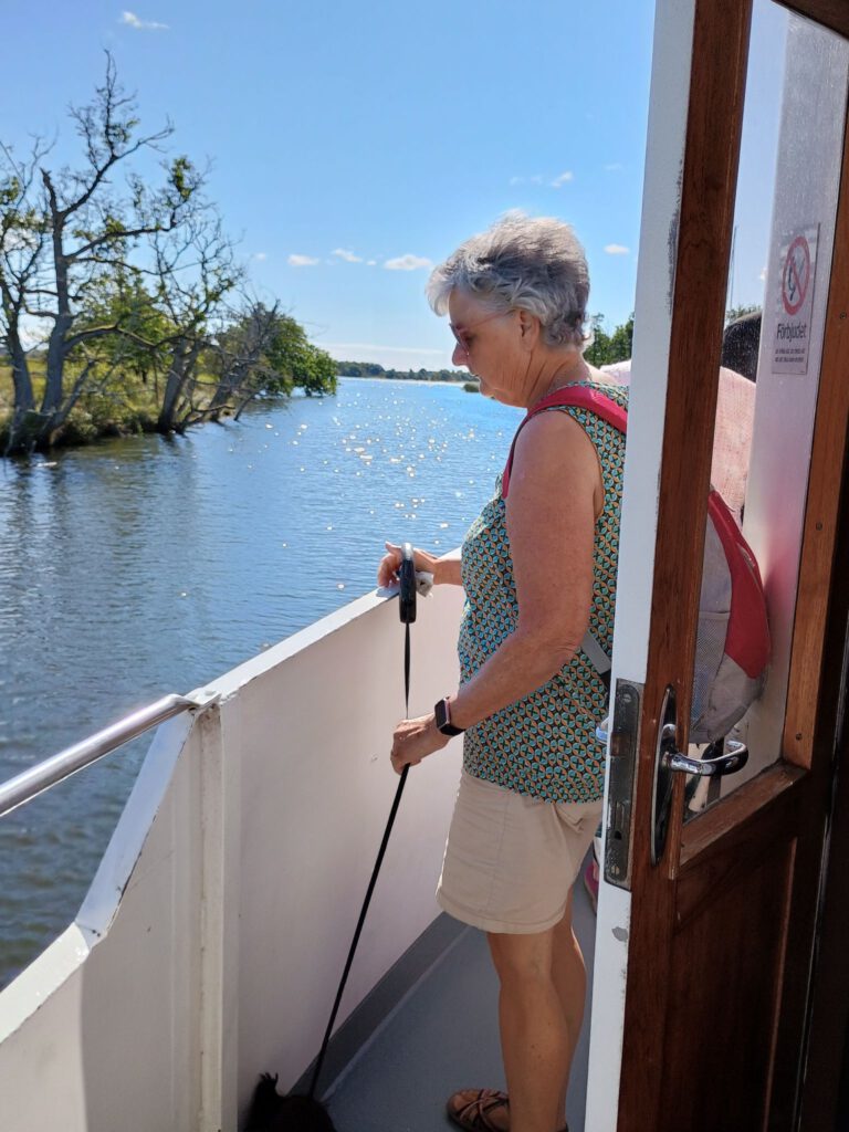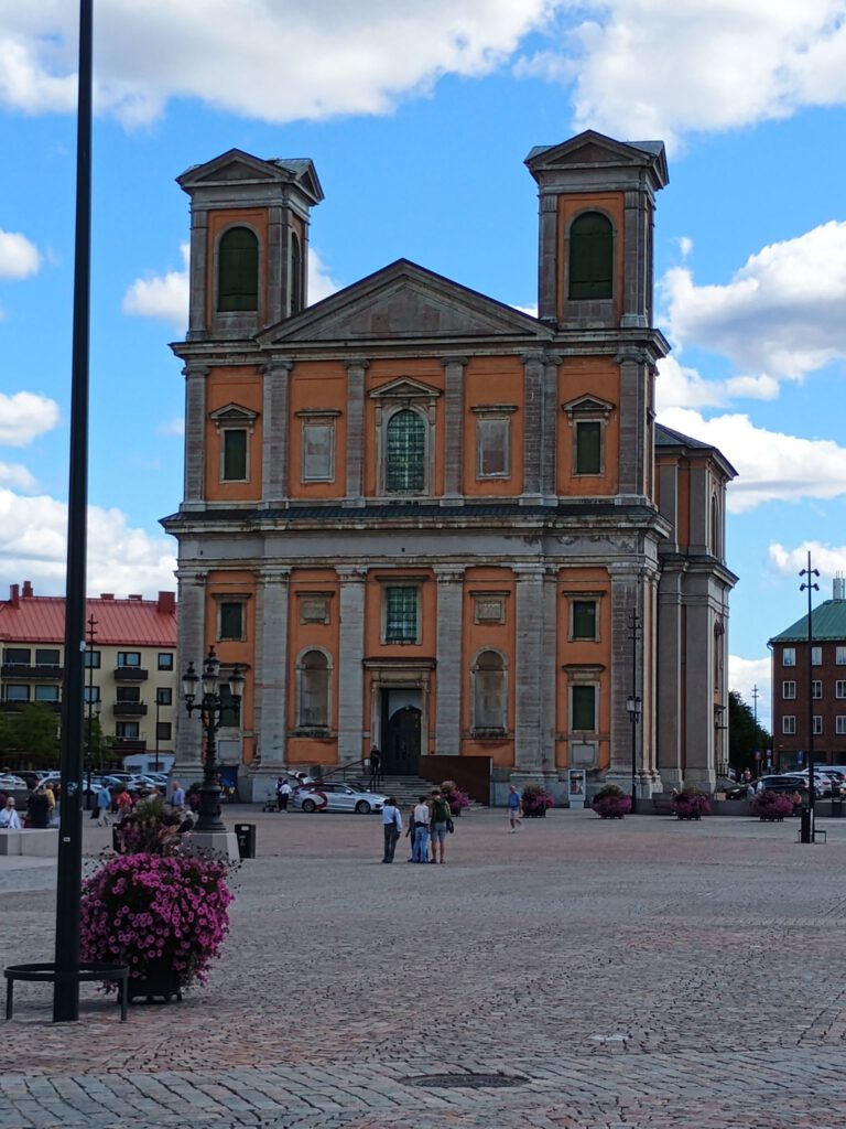 Het is prachtig weer dus we genieten van het boottochtje. Eenmaal in Karlskrona lopen we op ons gemak langs de haven en een stukje door de stad. Een uurtje is niet echt veel om veel te zien maar het lijkt een leuke drukke stad. We zien nog een mooie kerk, de Frederikskerk, André neemt een kijkje in de kerk, ik blijf buiten met Skip. Skip mocht gelukkig gewoon mee op de boot.