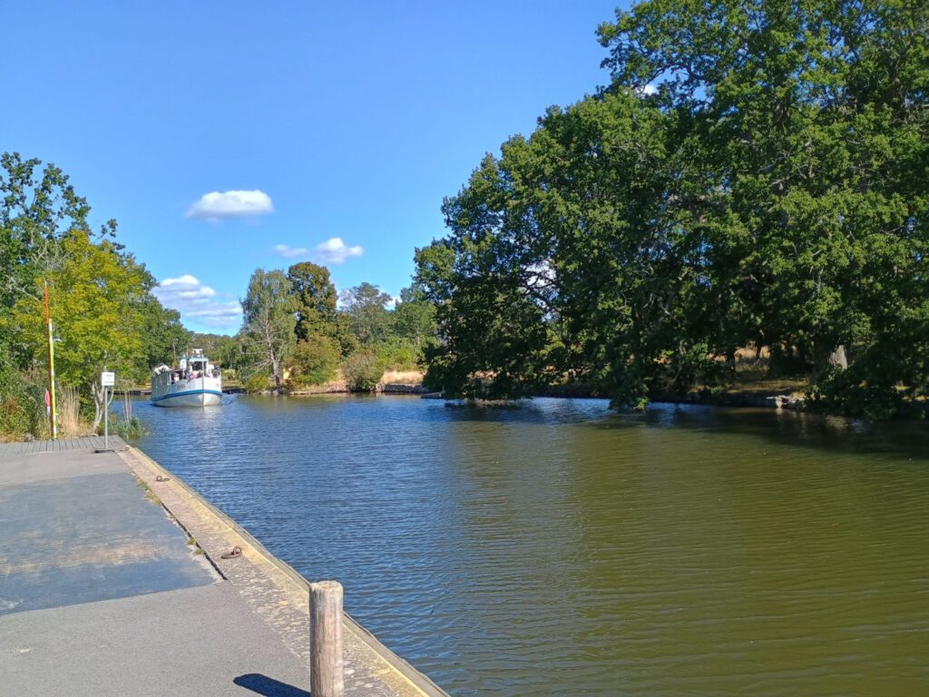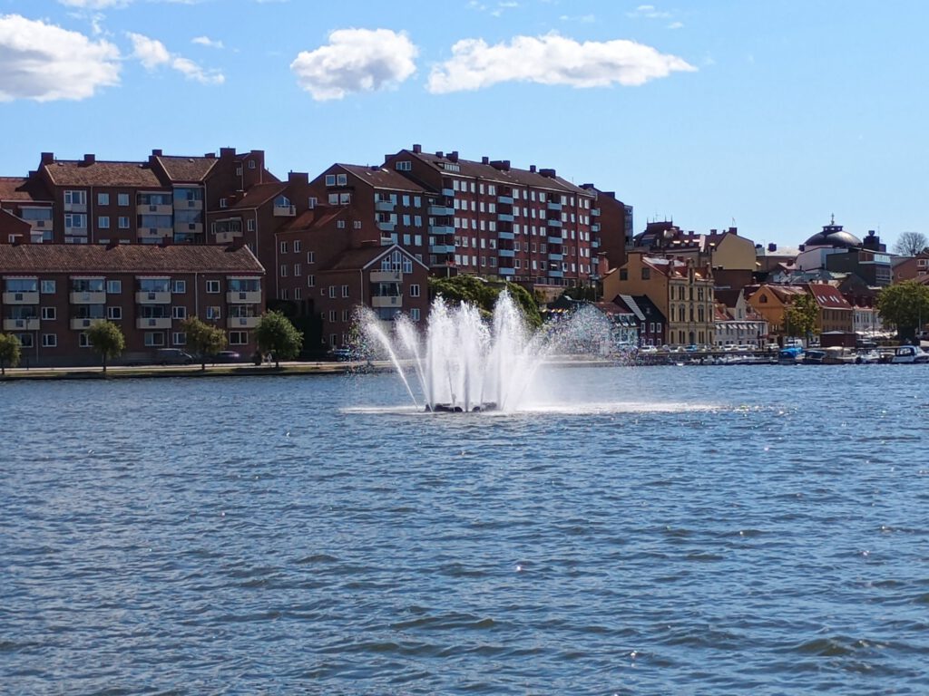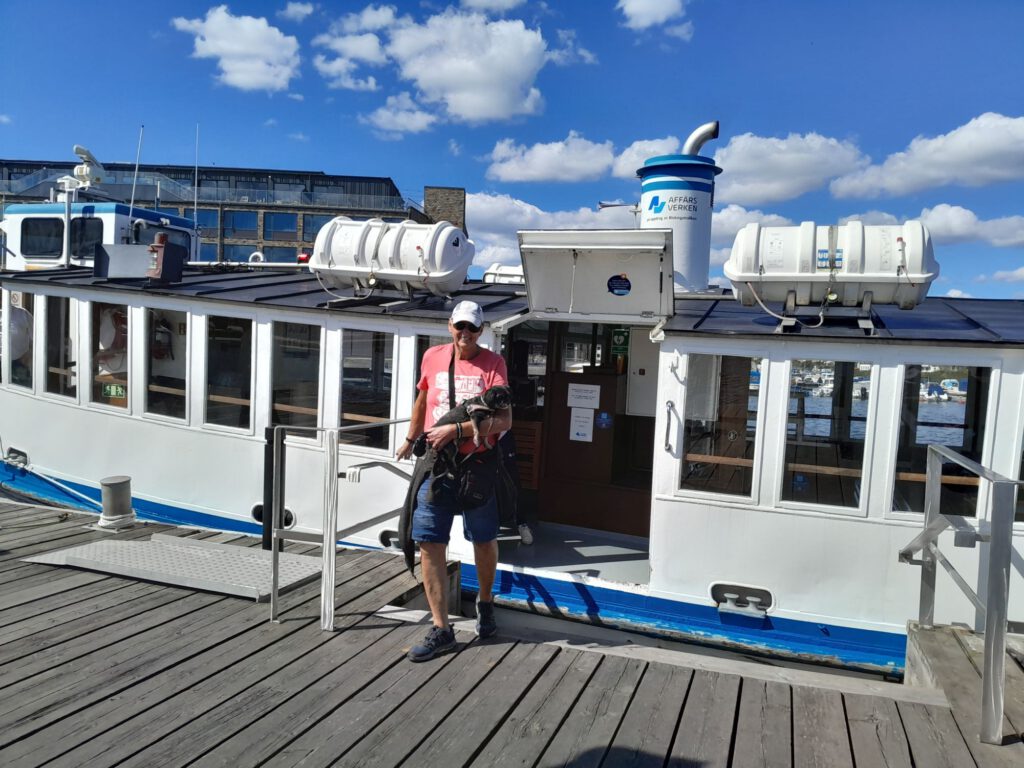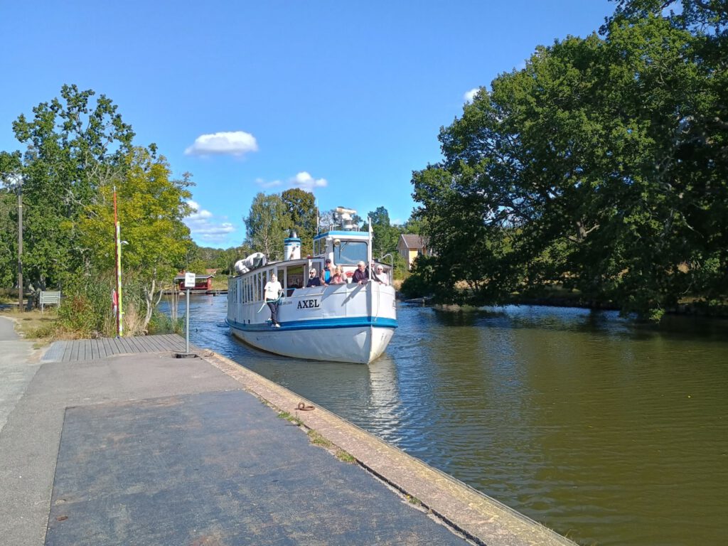 We zijn nog een dagje hier blijven staan. Gisteren zagen we een bord met een vaartocht die ook hier een opstapplaats heeft. Ik heb op internet gezocht hoe het precies zat en het leek ons wel leuk om zo’n tochtje te maken. Eigenlijk is het een soort busdienst die heen en weer vaart tussen Karlskrona en Nättraby, vanaf Nättraby is de camperplaats de derde halte die hij aan doet. De boot, de M/S Axel (een voormalige stoomboot) vertrekt vanaf de camperplaats en komt dan na veertig minuten aan bij het centrum van Karlskrona, daar kun je dan een uurtje doorbrengen voor hij weer terug vaart.