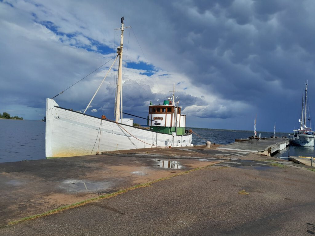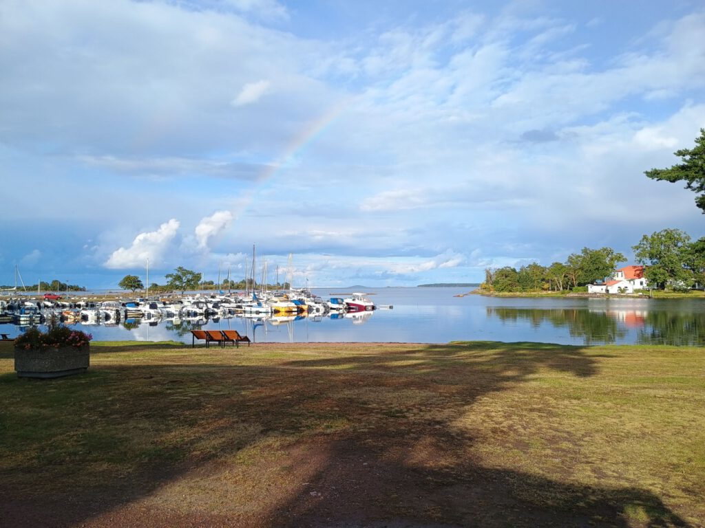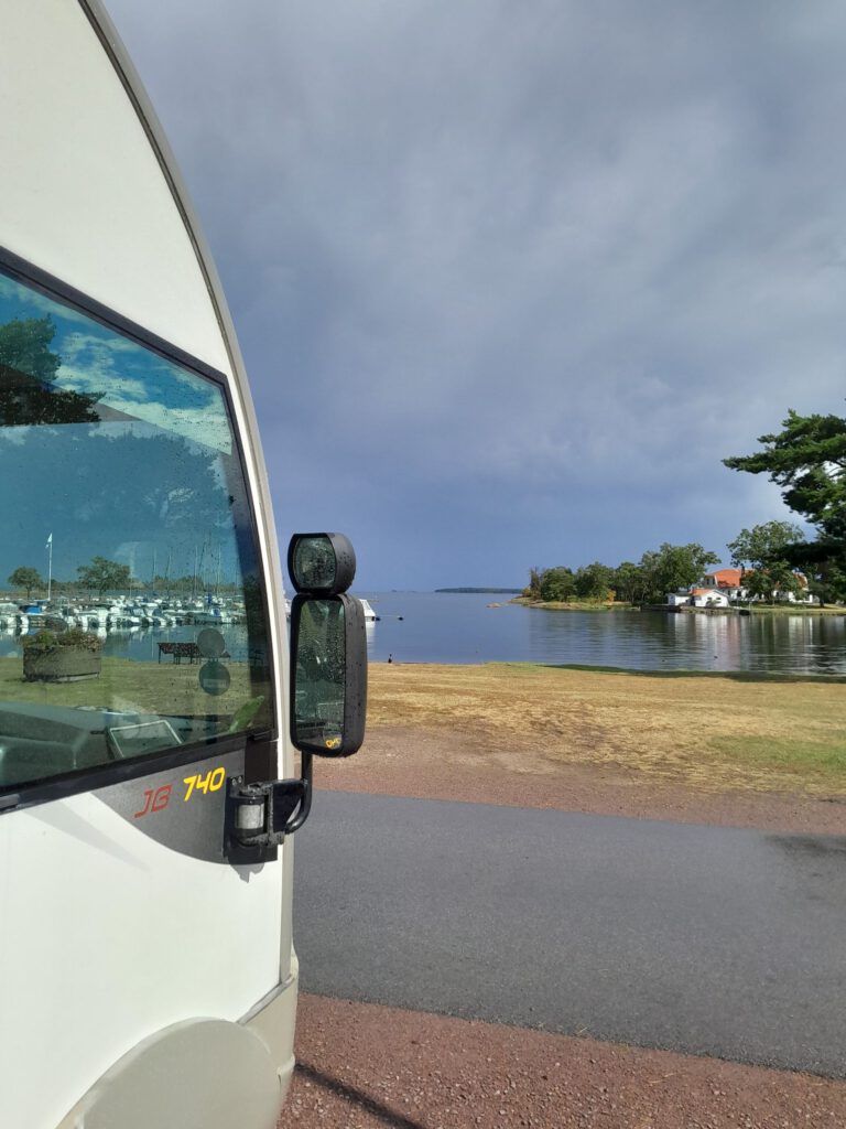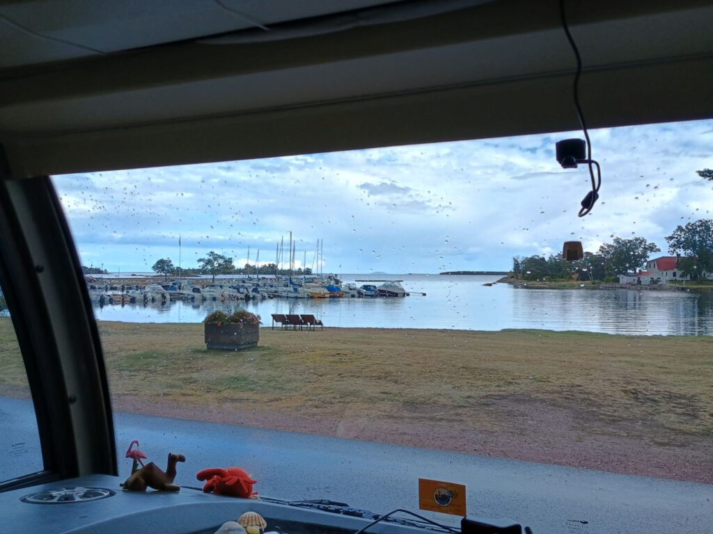 We zijn vandaag op een geweldige locatie gestrand. Nou ja, gestrand…. ik had de locatie wel uitgezocht natuurlijk. Voornamelijk omdat ik hier de was kan doen en dat is wel weer even nodig. Zweden kent niet zoals Spanje wasserettes, als je hier je was wilt doen dan zul je naar een camping of een wat luxere camperplaats moeten. We staan nu dus op een camperplaats bij de haven van Påskallavik. We vertrokken vanmorgen uit Nättraby met een zonnetje, na 140 kilometer op de E22 met nog drie kilometer te gaan tot onze bestemming begon het te druppelen, drie kilometer later op de camperplaats goot het inmiddels van de regen, balen hoor! Gelukkig werd het na een uurtje weer droog en hebben we nog wel een paar buitjes gehad maar ook regelmatig zonneschijn. Al met al viel het toch nog wel mee vanmiddag. We staan een aardig stukje (500 stappen op mijn stappenteller) van het toiletgebouw met de wasmachine vandaan. Ik had aardig wat was dus mijn stappen heb ik vandaag wel gehaald. We stappen vanavond in een heerlijk schoon bed, lekker hoor. De was die niet in de droogtrommel mag hangt door de hele camper heen, André zit gezellig met zijn hoofd in de was :-). Vanmiddag zijn we nog even naar de Coop gewandeld voor een paar kleine boodschapjes verder hebben we niet veel gedaan vandaag. Morgen blijven we nog een dagje hier even pas op de plaats voor we weer verder naar het noorden trekken.