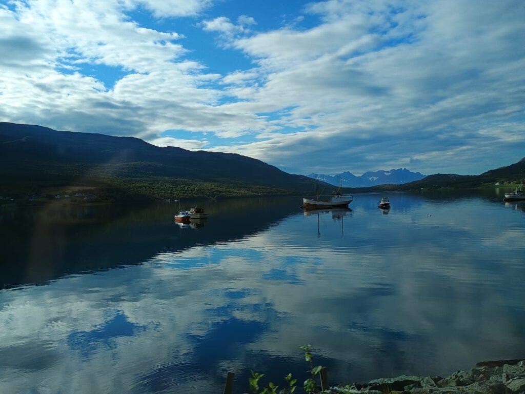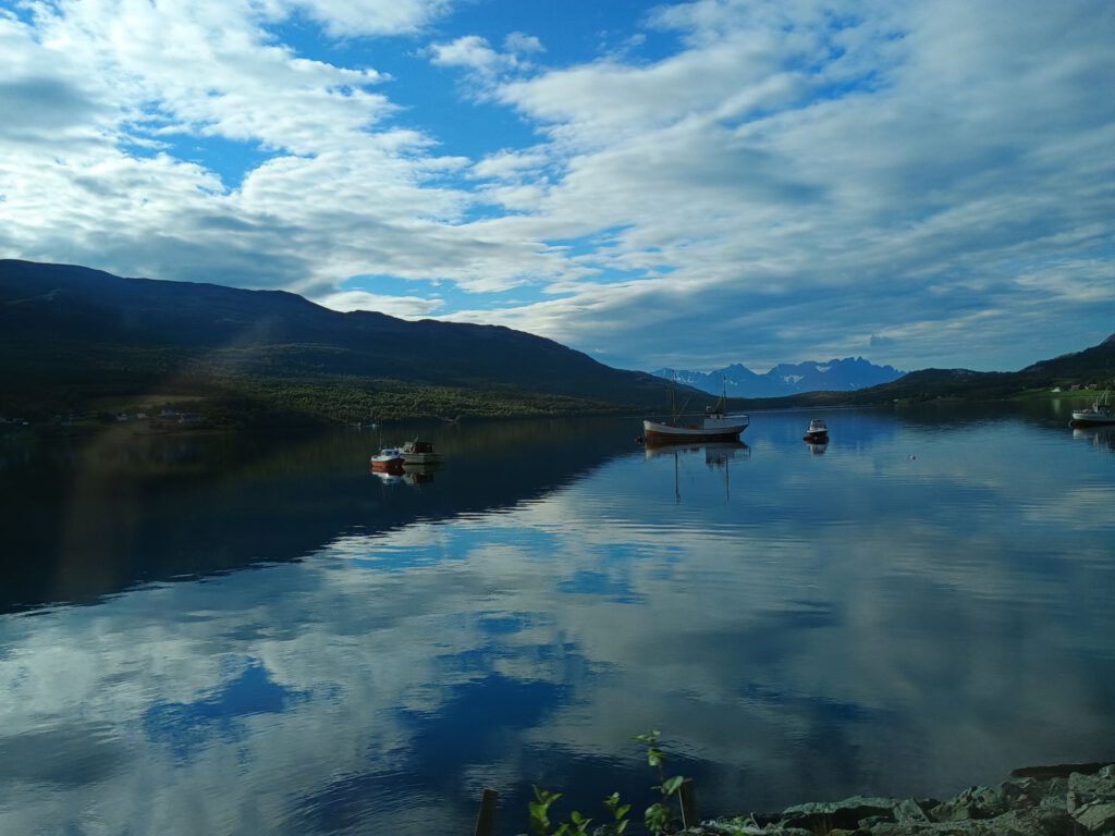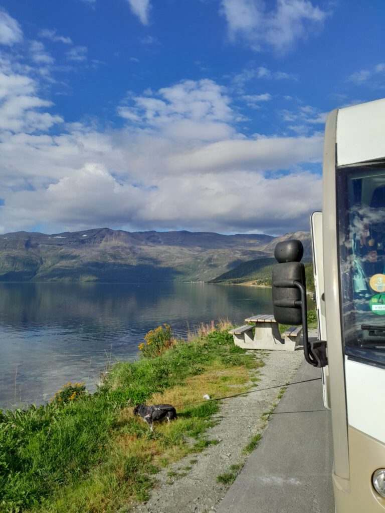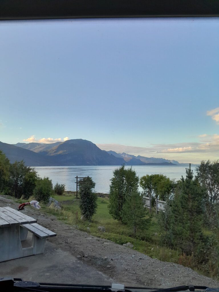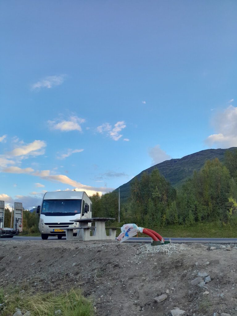 Na een lekkere ontspannen dag op Alta River Camping gaan we vandaag weer verder. Allereerst LPG tanken want dat is de reden dat we naar Alta zijn gereden. Daarna op zoek naar een onderdeel van de gasslang want die bleek een beetje te lekken (het lag dus niet aan mij dat is steeds gas rook). Dat onderdeel bleek verrassend makkelijk te krijgen, bij de derde poging was het raak. Als laatste naar een supermarkt om onze voorraad weer aan te vullen. Al met al was het toch al over twaalven voor we echt op weg gingen. Over onze rit is niet veel te vertellen behalve dat we genoten hebben van de geweldige uitzichten onderweg. We hebben dan ook heel veel foto’s gemaakt. We stoppen uiteindelijk net na Skibotn in de gemeente Storfjord.