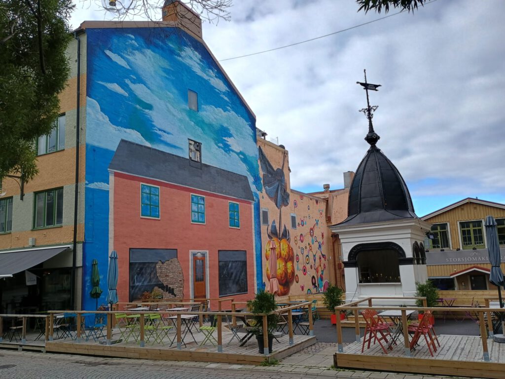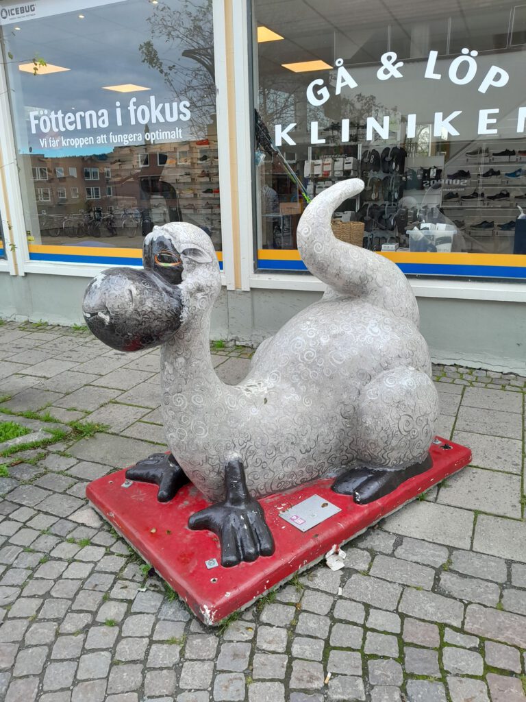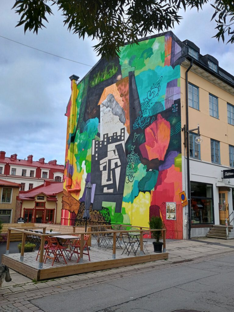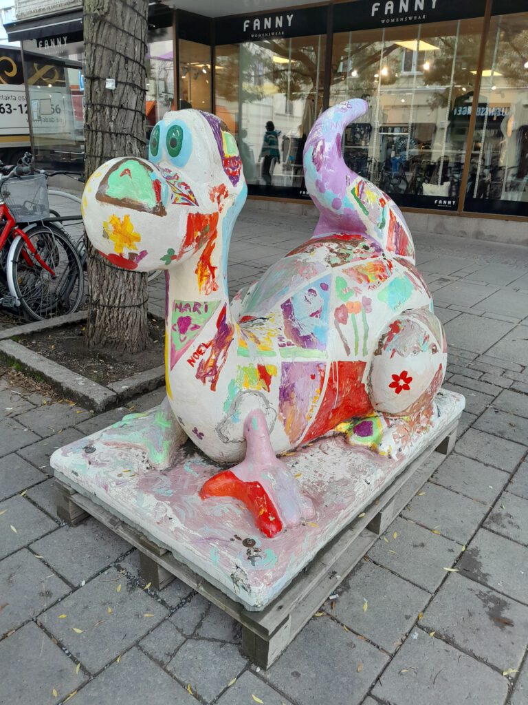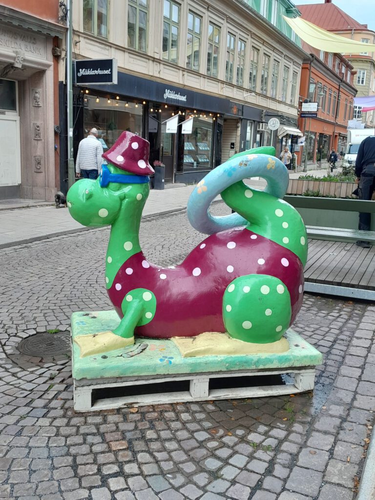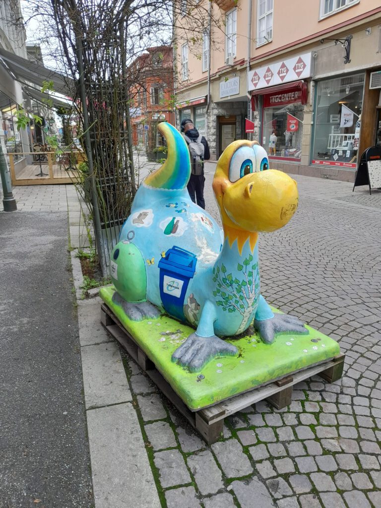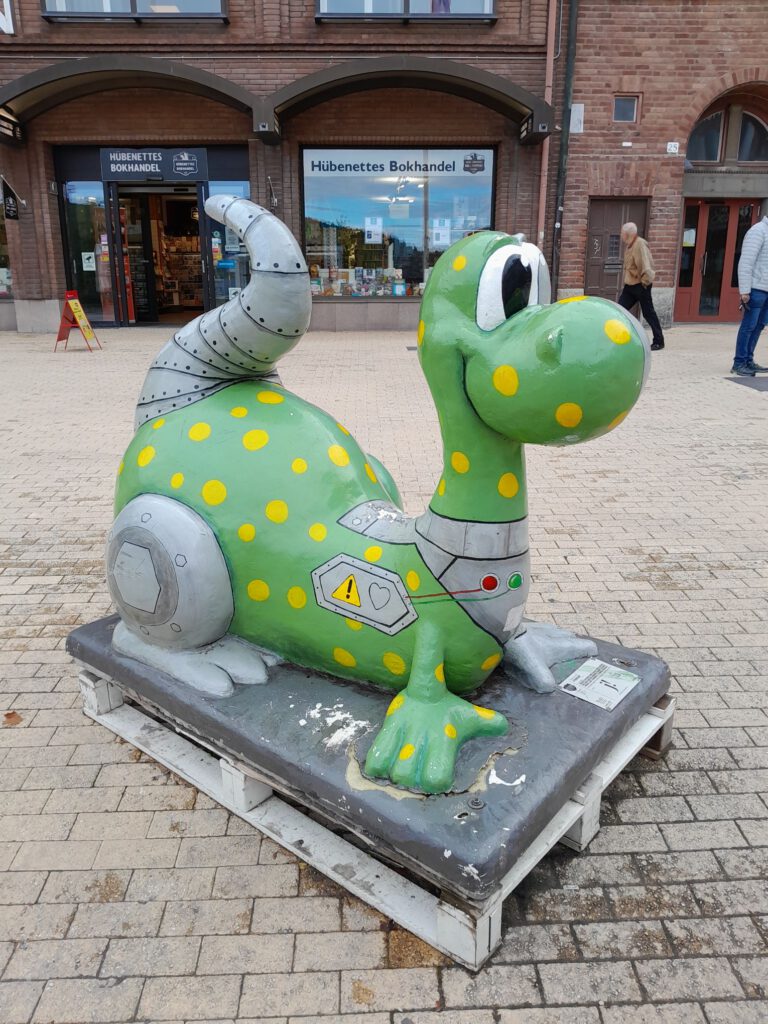 Rustig dagje vandaag. Hoewel we vanmorgen eerst aan een nieuwe route wilden beginnen omdat er regen was voorspeld zijn we toch nog een dag in Ostersund gebleven. Het zonnetje kwam ineens tevoorschijn en daarom hebben we toch maar een bezoekje gebracht aan het centrum. We parkeerden de camper op hetzelfde plekje als gisteren en liepen vandaar zo het centrum van Ostersund in. De zon was inmiddels wel weer verdwenen maar het was gelukkig wel droog. Een verrassend leuk centrum maar de mooie oude gebouwen die ons Zweedse camperboek ons beloofde hebben we niet gevonden. Wel wat muurschilderingen en veel kunstwerken van draken. Ik heb ergens iets gelezen over deze draken maar kan het nergens meer terug vinden. Het ging erom dat de stad vele malen verwoest is geweest door brand en dat deze draken een nieuwe brand tegen zouden moeten houden. Maar hoe het precies zat kan ik dus niet meer vinden. Na het bezoekje aan het centrum zijn we nog even naar de Lidl geweest en toen weer terug naar het plekje bij de ICA, niet inspirerend maar wel rustig. De rest van de dag hebben we heerlijk geluierd, geslapen en gelezen. Lekker zo’n dag weer een keertje.