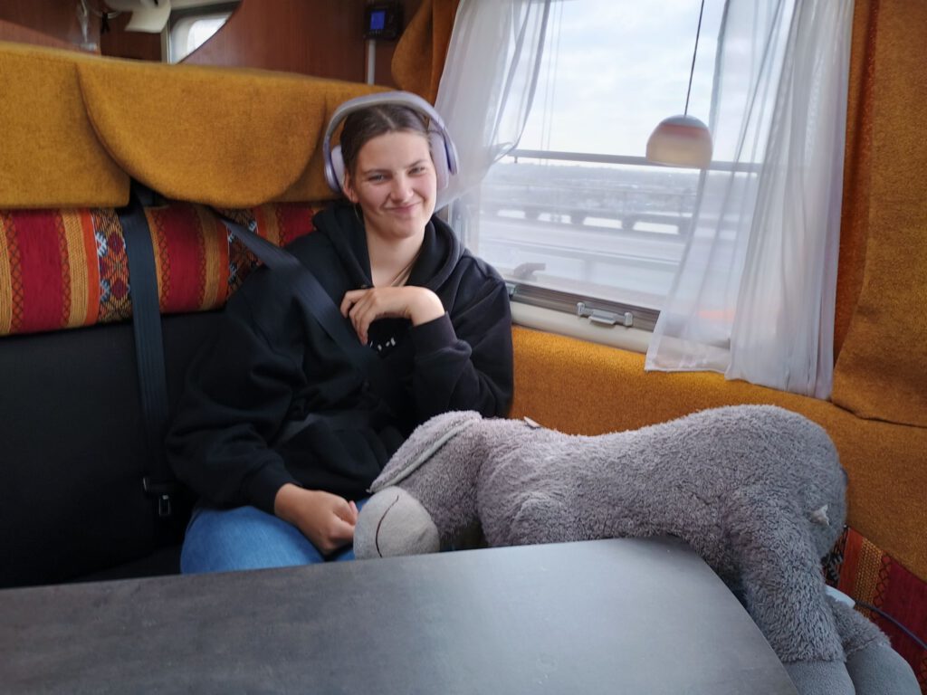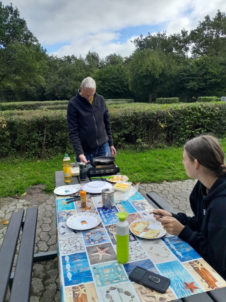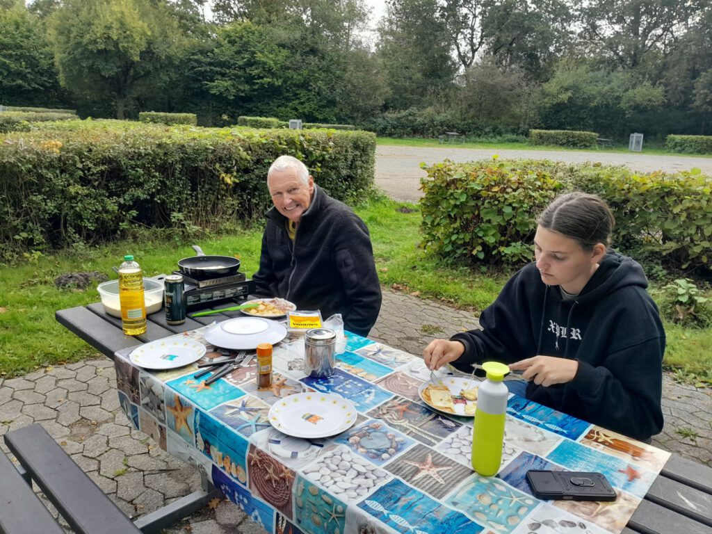 Gisteren zijn we een dag in Ringsted gebleven. We hebben een wandelingetje gemaakt naar het outlet centrum wat vlak bij de camperplaats is. Daar was niet echt veel te beleven maar goed we hadden even wat te doen en het was zowaar even droog. Want mensen mensen wat een regen hebben we gehad de afgelopen twee dagen. Vandaag is het weer een stuk aangenamer, regelmatig schijnt de zon alleen de wind is nog steeds stevig en op de grote Beltbrug moet ik het stuur stevig vast houden en zelfs dan slingert de camper soms nog heen en weer, niet echt ontspannen rijden zo. Als we op de uitgezochte camperplaats aankomen is het zelfs bijna 16 graden in de zon uit de wind. Dat benutten we gelijk door buiten te lunchen. André en Lotte willen graag pannenkoeken eten en die kunnen dan mooi buiten gebakken worden, scheelt een hoop vieze luchtjes in de camper. Na de lunch gaan Lotte en ik op zoek naar een geocache, die moet hier in de buurt zijn. Als we even lopen blijken er hier heel veel te zijn en je kunt zelfs een route volgen van 23! km waar er dan 99 vinden….. Dat vinden we wel heel erg ver maar een rondje van een kilometer of drie zien we wel zitten. Op dat rondje vinden we er acht van de negen, goed resultaat! Zeker omdat we er van de week drie gezocht hebben en er geen een vonden. Op het wandelingetje komen we langs de ingang van kamp Frøslevlejren waar we morgen naar toe willen. Jammer genoeg is het op maandag gesloten vandaar dat we gisteren ook in Ringsted zijn blijven staan.